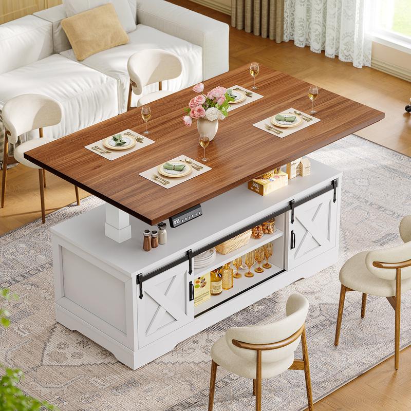 Smart Electric Lift: height adjustment from72 cm - 119 cmmotors workingbelow 45 dB. Charging Port: Includes2 Outlets, 1 USB Port, and 1 Type Cpara proporcionar energía para hasta 4 dispositivos. Farmhouse Coffee Tablecoffee table farmhouseThe adjustable height will instantly elevate your living room. • Ample Storage: The2 Open Storage & 2 Sliding Barn Doorscan place chess pieces, remote controls Invest in Your Wellness & Productivity: This electric coffee table encourages movement by allowing you to easily switch between sitting and standing positions while working or relaxing.Sitting and Standing.