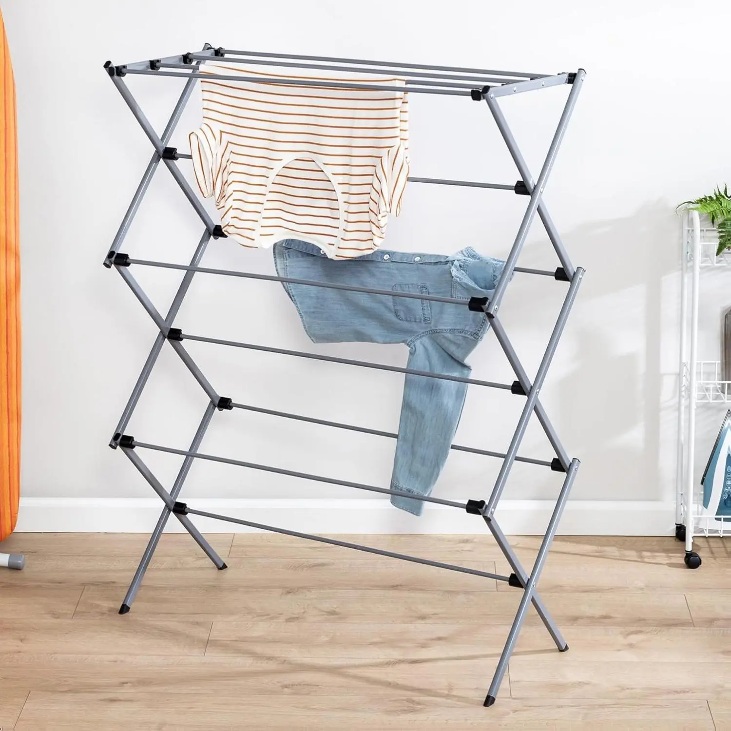 Can-Do Collapsible Clothing Rack, a perfect solution for drying clothes indoors or outdoors. Designed for small spaces, this foldable-clothes drying rack easily collapses for compact storage, making it ideal for apartments, laundry rooms, dorms, and even travel. With a portable dryers for laundry design, this lightweight yet durable clothes dryer rack can be moved effortlessly between rooms or placed on a balcony or patio. Made from sturdy steel, it holds up to 50 lbs., offering ample space to hang shirts, pants, towels, and delicate garments. Its sleek silver finish blends with any decor while keeping your laundry area tidy. This energy-saving alternative to electric dryers helps reduce wear and tear on clothes, extending their lifespan while lowering utility costs. Whether you need extra drying space for everyday laundry, delicate fabrics, or even pasta, this collapsible clothing rack is a must-have. Easy to set up, store, and transport, the clothes dryer rack offers a practical, space-saving, and eco-friendly drying solution. Keep your clothes fresh, your space organized, and your laundry routine efficient with this versatile drying rack.