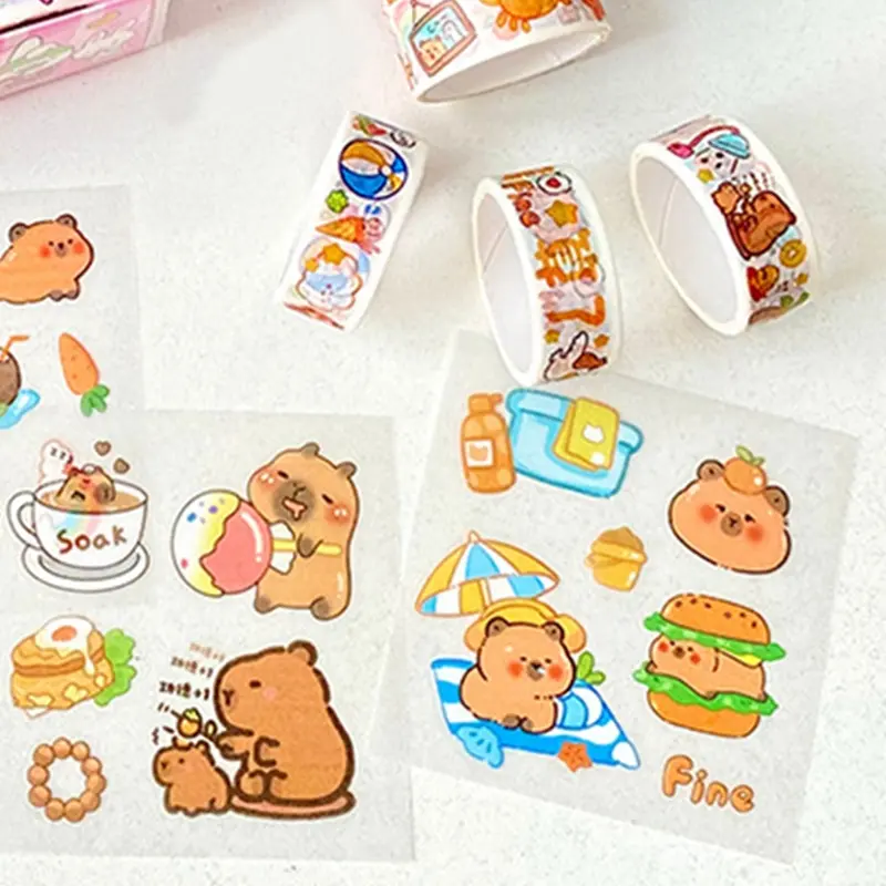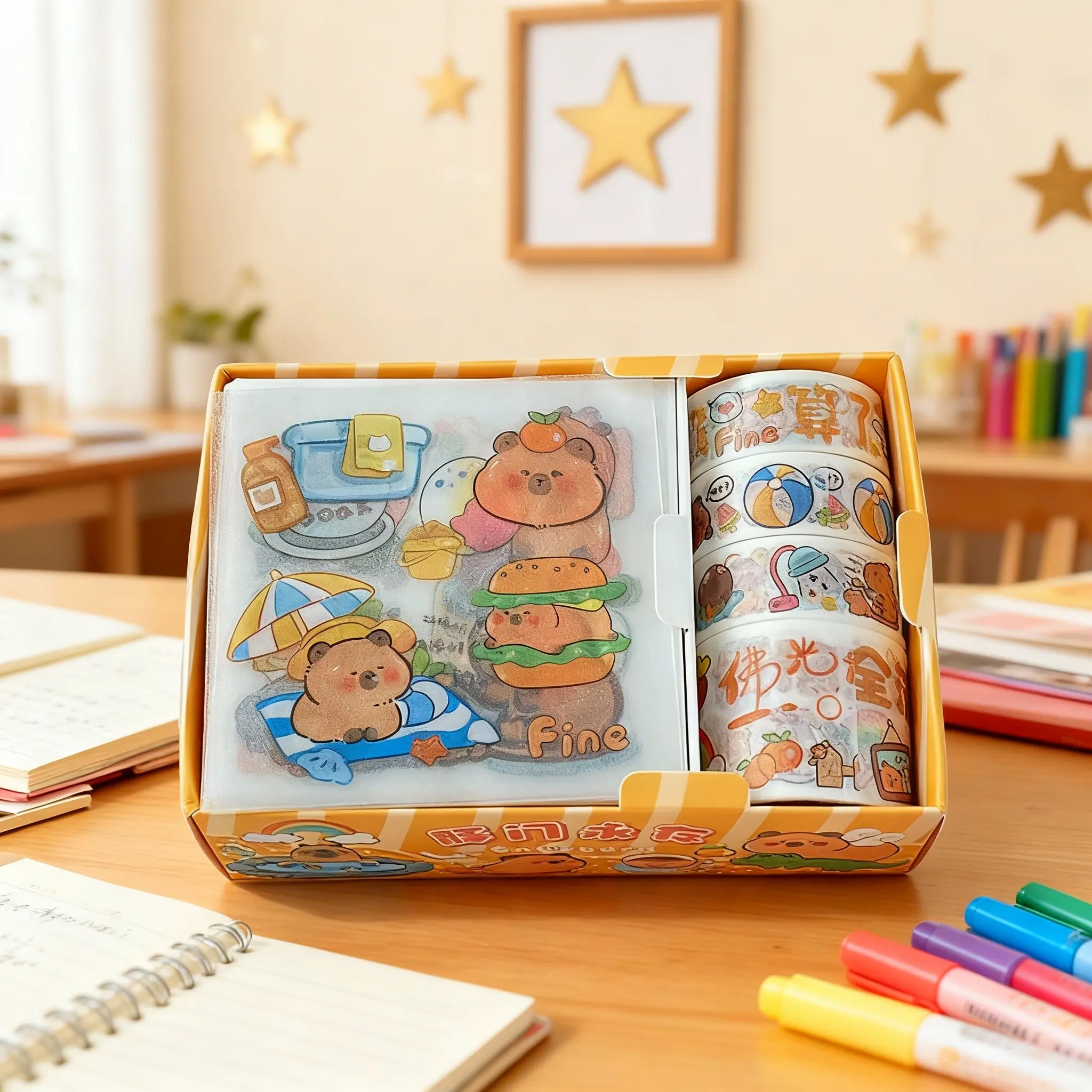 Capybara Themed Stationery Gift Set, 4 rolls of tapes and 4pcs stickers, DIY decorative stickers, suitable for decorating stationery, books, laptops, water bottles, mobile phone cases