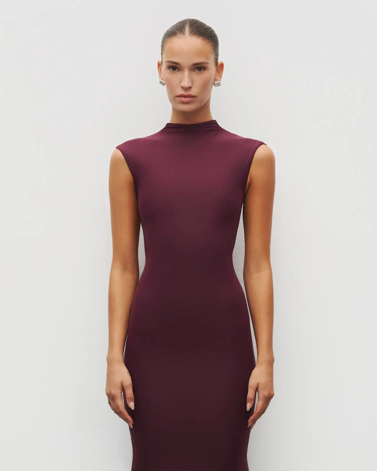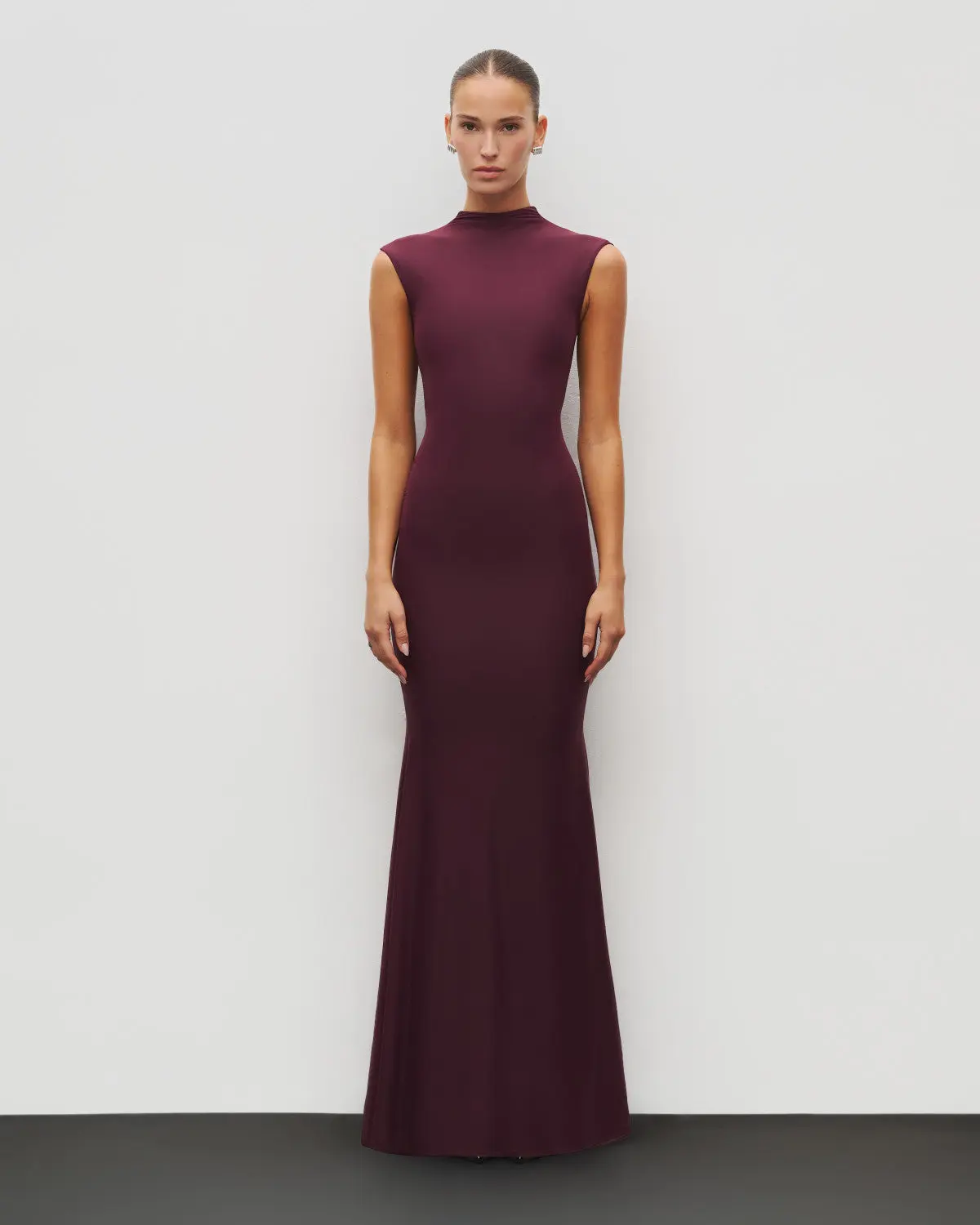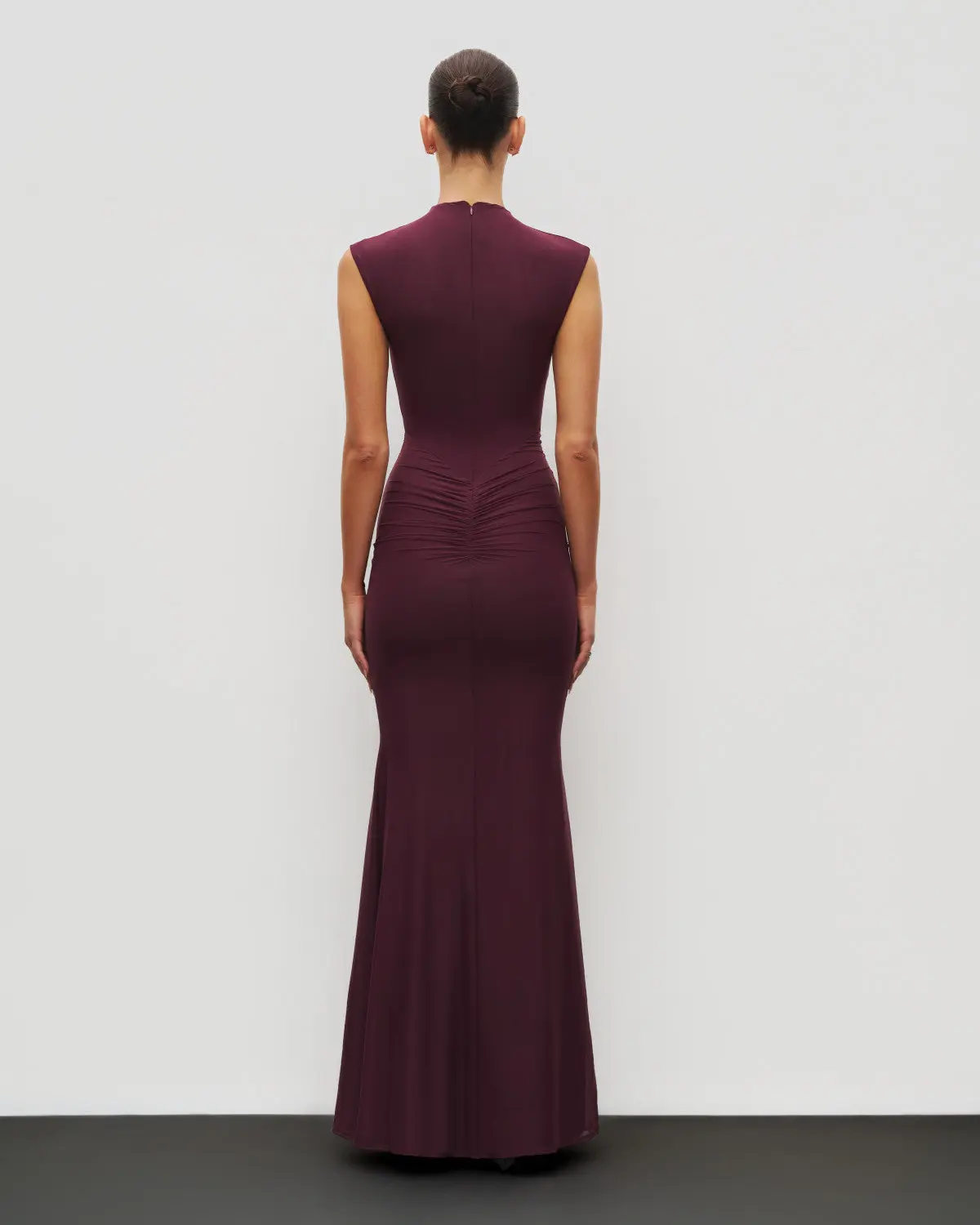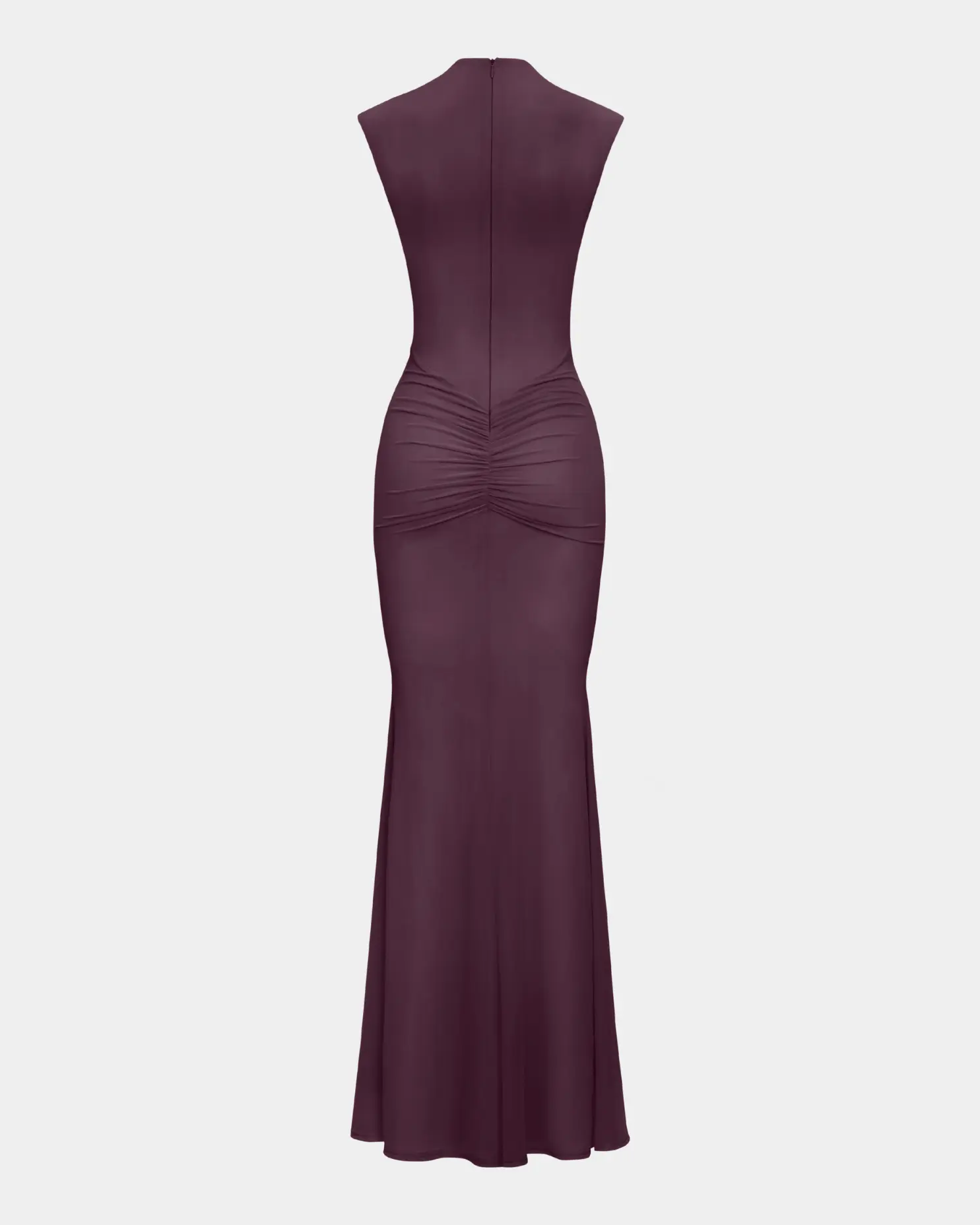 Cut from Heiress’ signature double-layered power mesh, this sculptural dress smooths and defines every curve. The mock neckline and precision ruching contour the silhouette with a refined, architectural finish. A sleek, full-length design engineered to shape, support, and elongate the body.