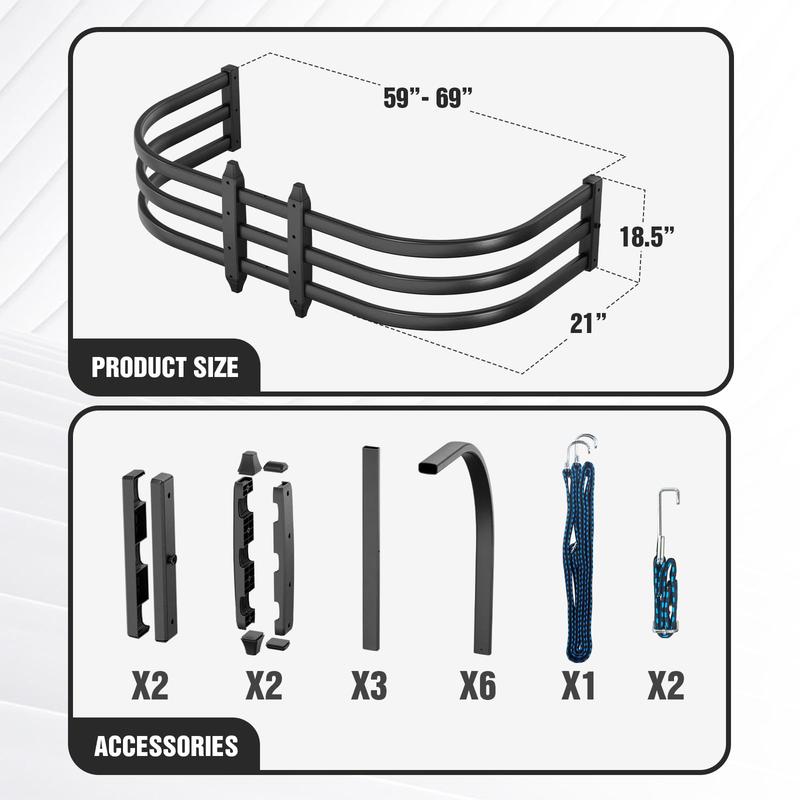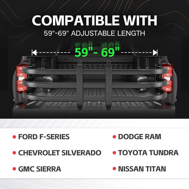 【Adjustable Length】: Our Truck Bed Extender features an adjustable length range of 59 to 69 inches, ensuring a perfect fit for your pickup truck. Additionally, you can seamlessly flip and install it without any interference.