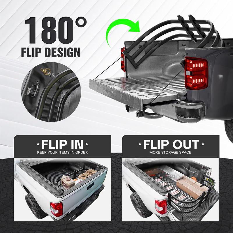 【Retractable Tailgate Extender】: Featuring a 180° flip design, this bed extender maximizes functionality. When flipped to the tailgate position, it adds 21 inches of loading space, perfect for larger items like ladders, lumber, kayaks, and UTVs. Conversely, flipping it into the truck bed creates a secure cargo space to keep items safe and prevent them from rolling around and causing damage.