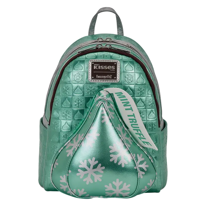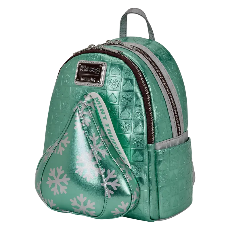 This mini backpack features a mint truffle kiss on the front pocket, complete with metallic faux leather and silver foil. The rest of the bag features more metallic faux leather and a debossed pattern with snowflake and Kiss symbols. Plus, for some extra fun, you'll find appliques of Kisses on the straps!