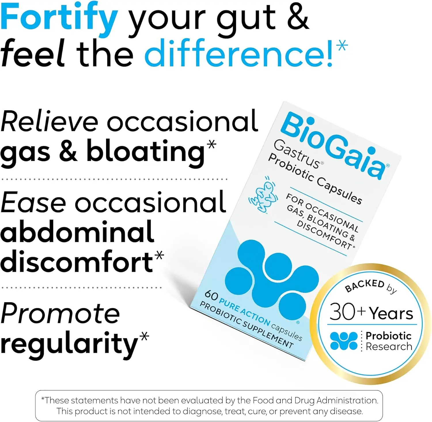 BioGaia Gastrus contains L. reuteri strains that are commonly found in the human gut and are used in probiotic supplementation to support microbiome balance.