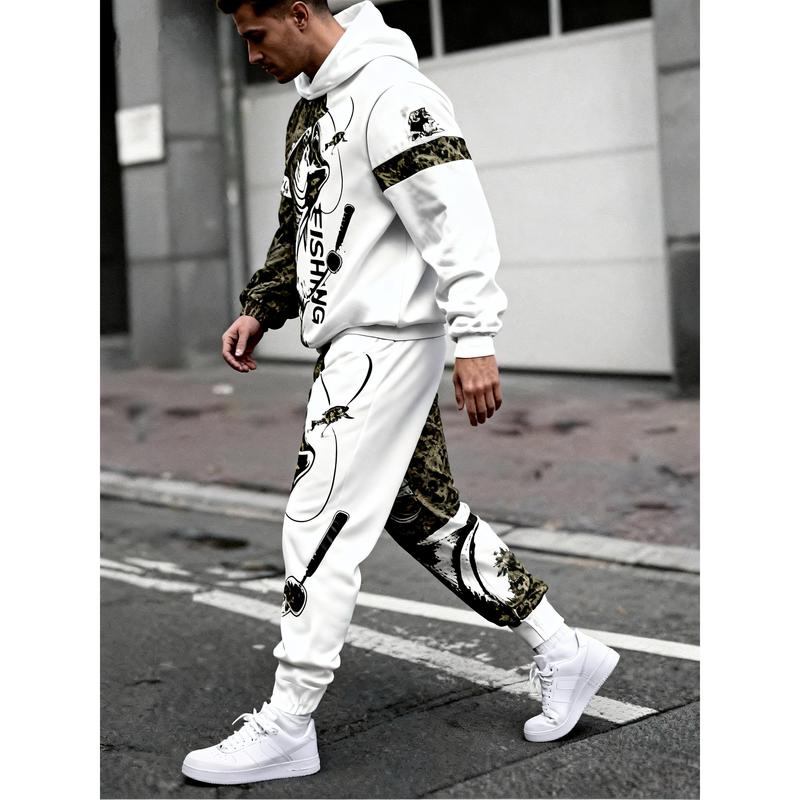 European and American men's digital printed hooded sweatshirt+pants set - salmon print camouflage splicing, fashionable running casual two-piece set