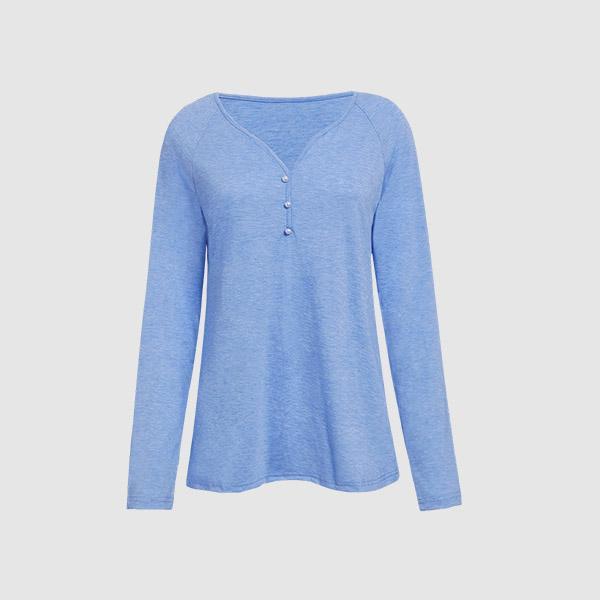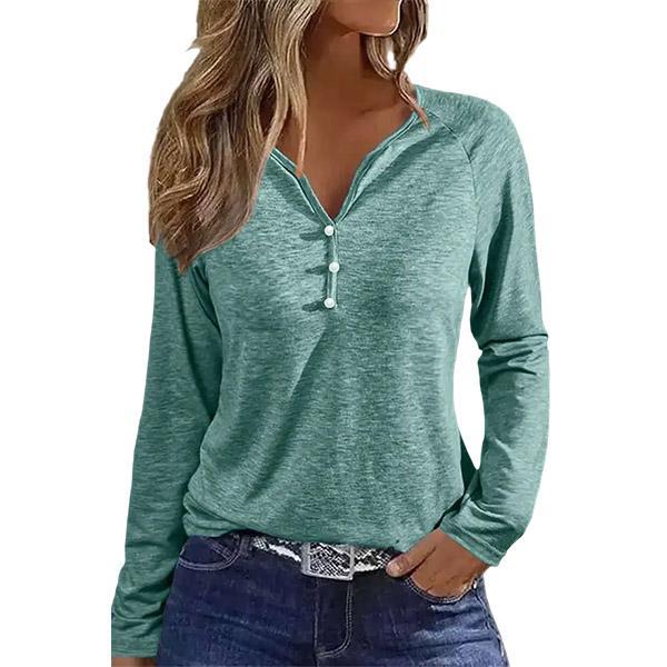 Flamingals Solid Half Button Notched Neck Long Sleeve T-Shirt for Women