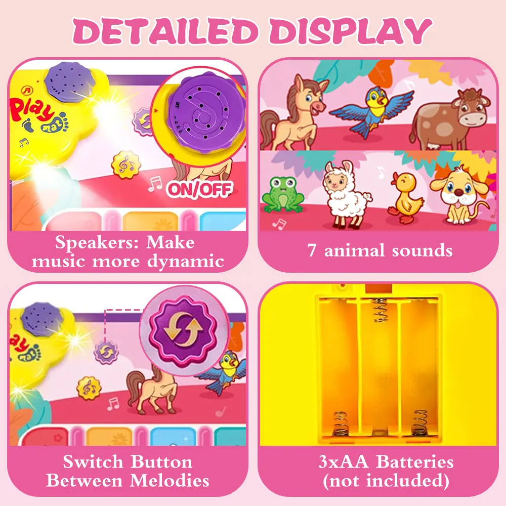 ·Multifunctional Musical Mat: this playmat has 2 modes, the random mode can play 9 melodies, one-click mode has 9 music keys and 8 animal sounds; the sound is clear and the volume is adjustable, cute animal for kids will make early learning more fun