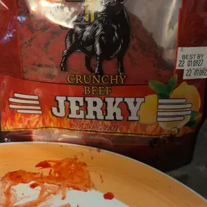 El Ranchito Jerky presents Blazing hot 2oz. This crunchy beef jerky is crafted with 100% beef, iodized salt, and maltodextrin. It features natural and artificial flavors, monosodium glutamate, and citric acid. The jerky includes a mix of chili peppers, non-hydrogenated RBD soy vegetable oil, and FD&C Red #40. It also contains added sugars, garlic, onion, inosinate, sodium guanylate, calcium silicate, silicon dioxide, and canola oil. Contains soy.