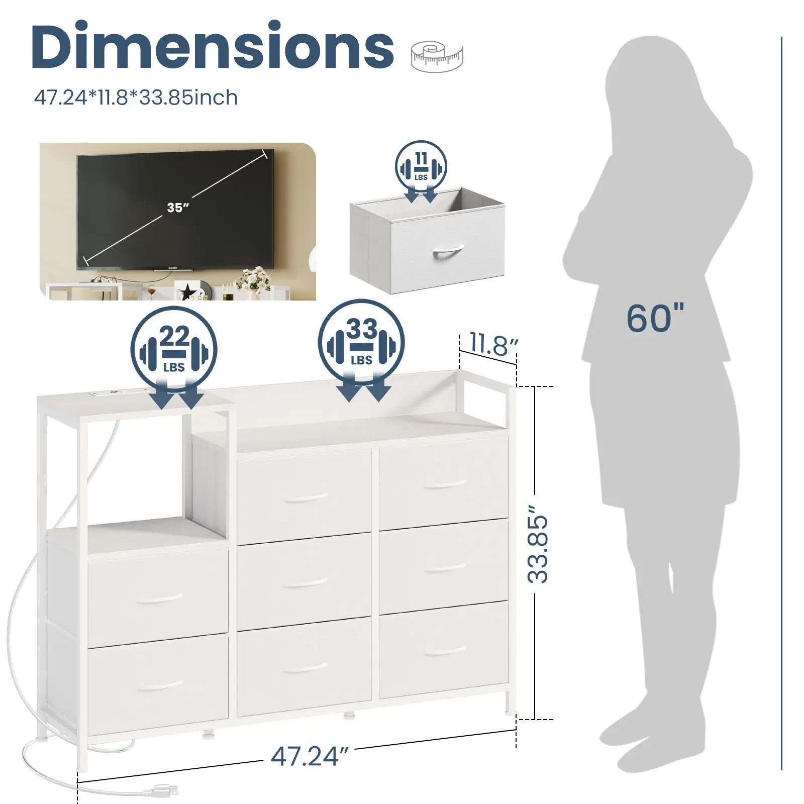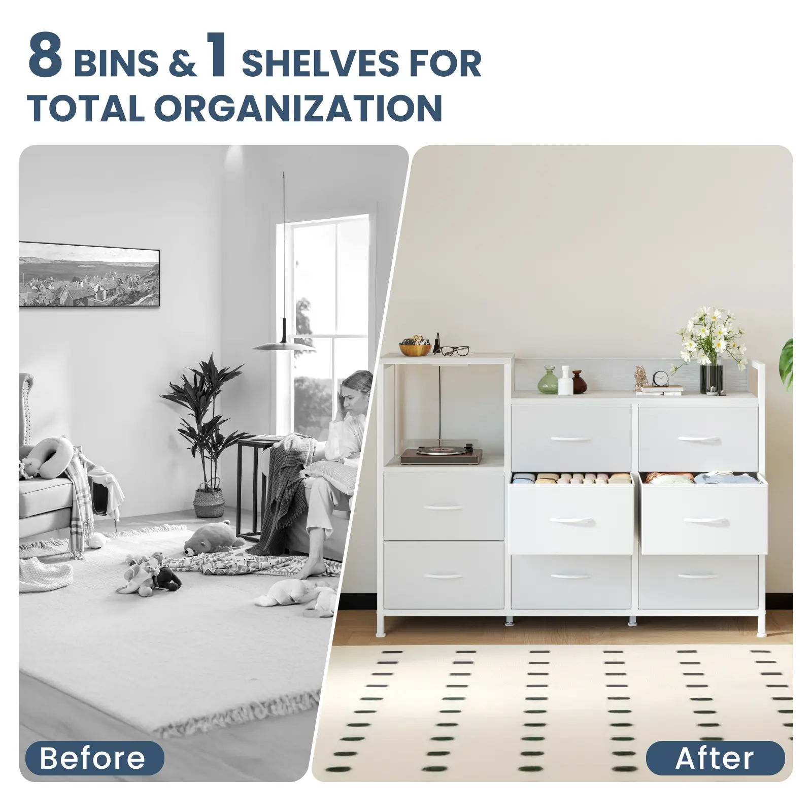 ·[8 Bins & 1 Shelves for Ample Storage]: Achieve ultimate organization with this practical TV stand with drawers. It features 8 soft-closing fabric drawers and 1 open shelves, providing generous space for media accessories, games, books, and more, helping you maintain a tidy and clutter-free space.