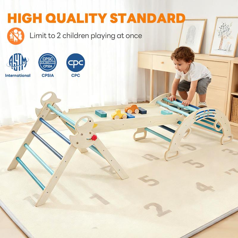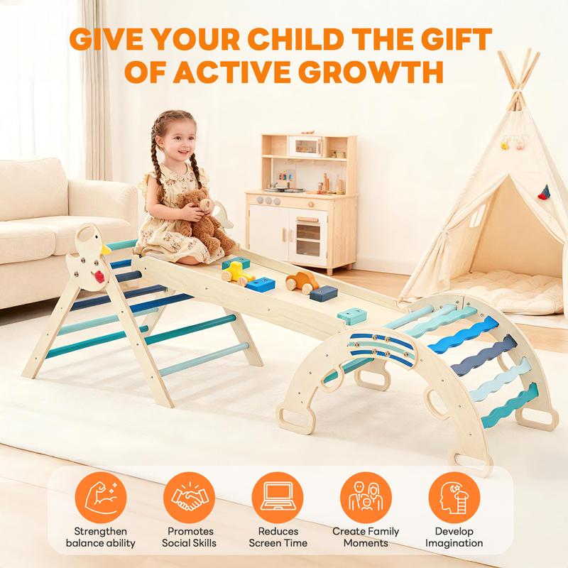 ·【9-in-1 Versatile Play Configurations】Watch this wooden climbing gym transform into multiple adventure setups! The modular pikler climbing set includes arch, ramp, and ladder components that rearrange easily, supporting creative scenarios from gentle slides to challenging climbs.