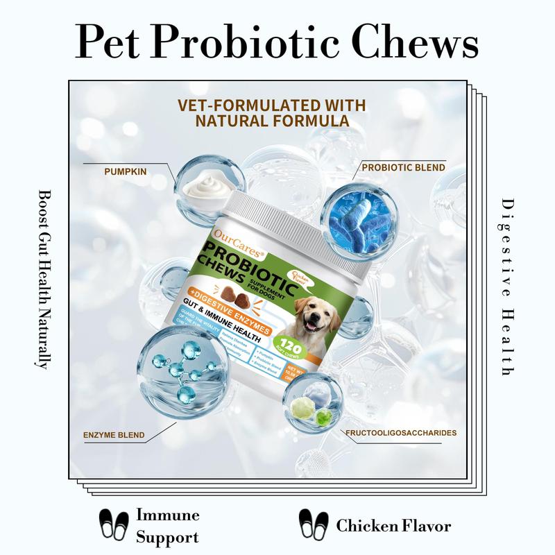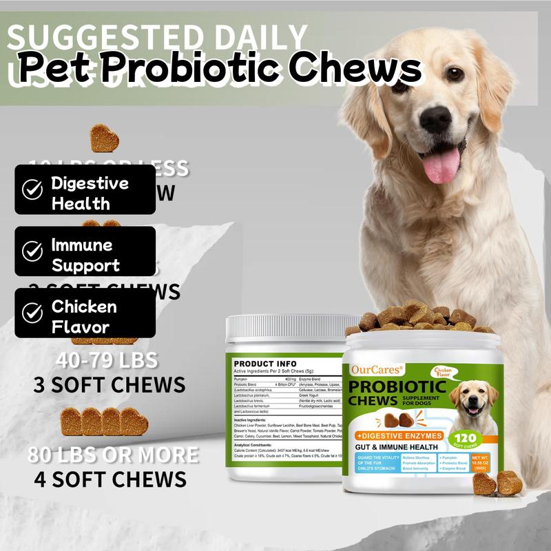 OurCares Pet Probiotic Chewable Tablets with Lactobacillus acidophilus & Bifidobacterium lactis support digestive health and immunity. Each pack contains 120 soft chews in chicken flavor. These tablets maintain balanced gut microflora, protecting against harmful bacteria. Suitable for pets with indigestion, diarrhea, constipation, bad breath, and imbalanced gut flora.
