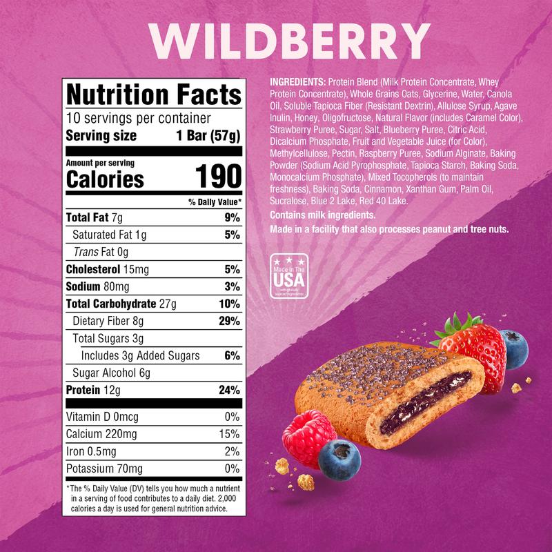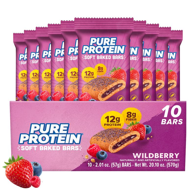 Start your morning with a bright burst of berry flavor! Pure Protein Wildberry Soft Baked Protein Bars are made with wholesome ingredients and a fruity blend of strawberries, raspberries, and blueberries for a snack that satisfies every craving. Each bar delivers 12g of protein and 8g of fiber, making it an easy, delicious choice for breakfast, school snacks, office snacks, or healthy on-the-go fuel anytime you need it.