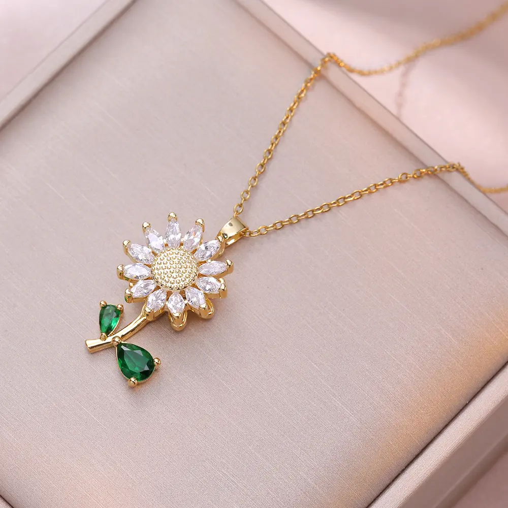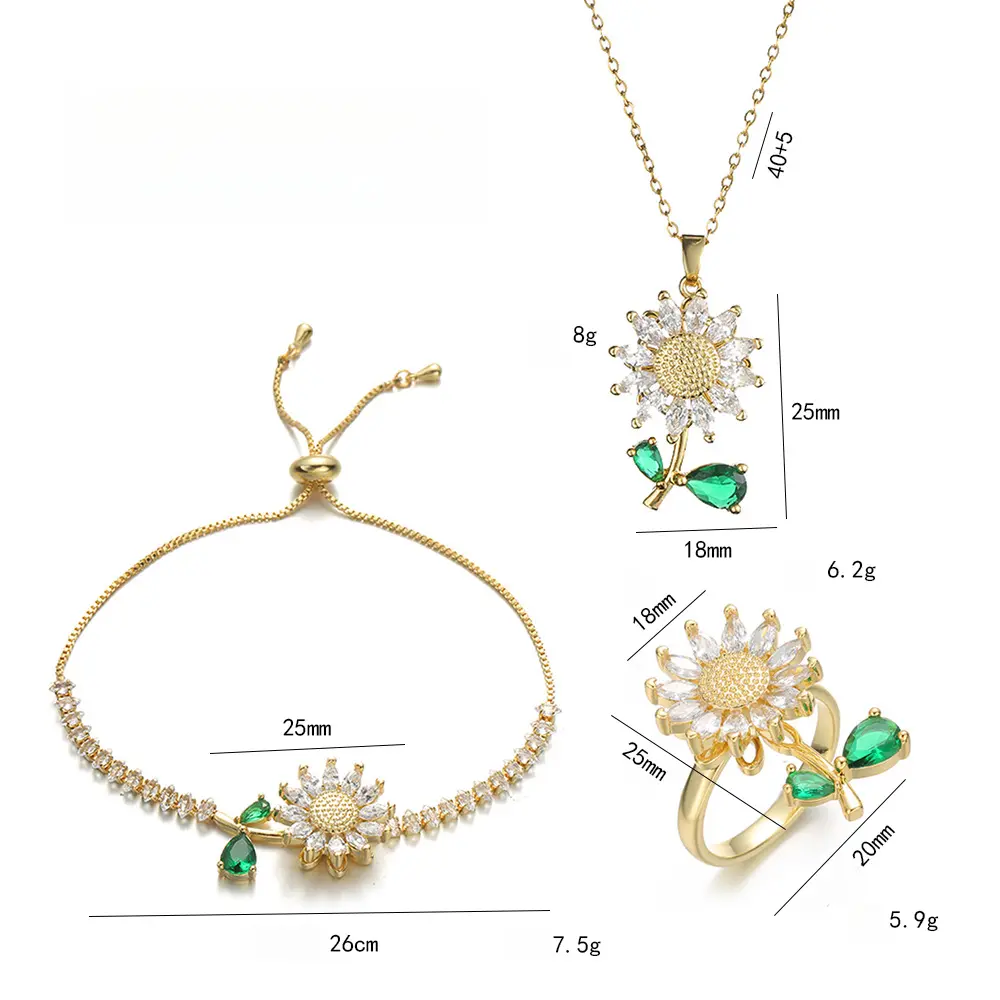 3PCS Jewelry Set, Green Leaf, Rotating Sunflower Zircon Necklace Ring Bracelet Fashion Suit Clavicle Chain