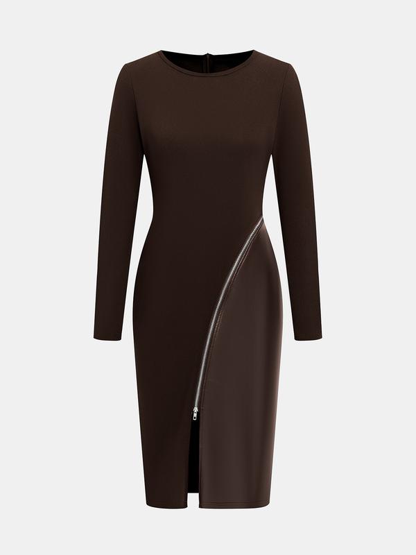 Women's Solid Color PU Leather Patchwork Zipper Bodycon Dress, Elegant Slim Fit Long Sleeve Party Dress, Casual Fashion Clothing #longpartydress #womensdress #leatherdress #womensfashion #tiktokshopcreatorpicks