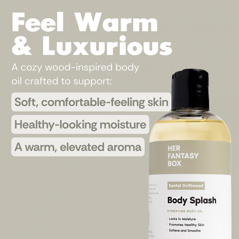 ·Santal Driftwood Body Splash OilA luxurious, woody body oil with creamy sandalwood, warm amber, fig, and citrus. Absorbs instantly and leaves skin velvety-soft with a sensual, lingering scent ideal for date night.