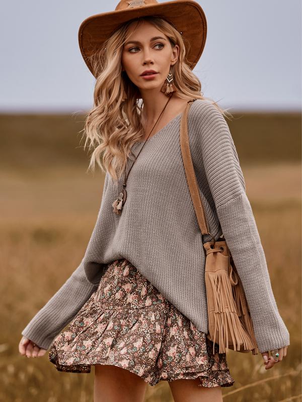 Made from 60% Acrylic and 20% Cotton, this sweater is soft and comfortable. The waffle knit top features a front/back V-neck, long sleeves, and ribbed edges. It offers a loose style with a subtle feminine touch. The model wears a size Small, with a height of 5'7", bust 32", waist 25", and hips 30".