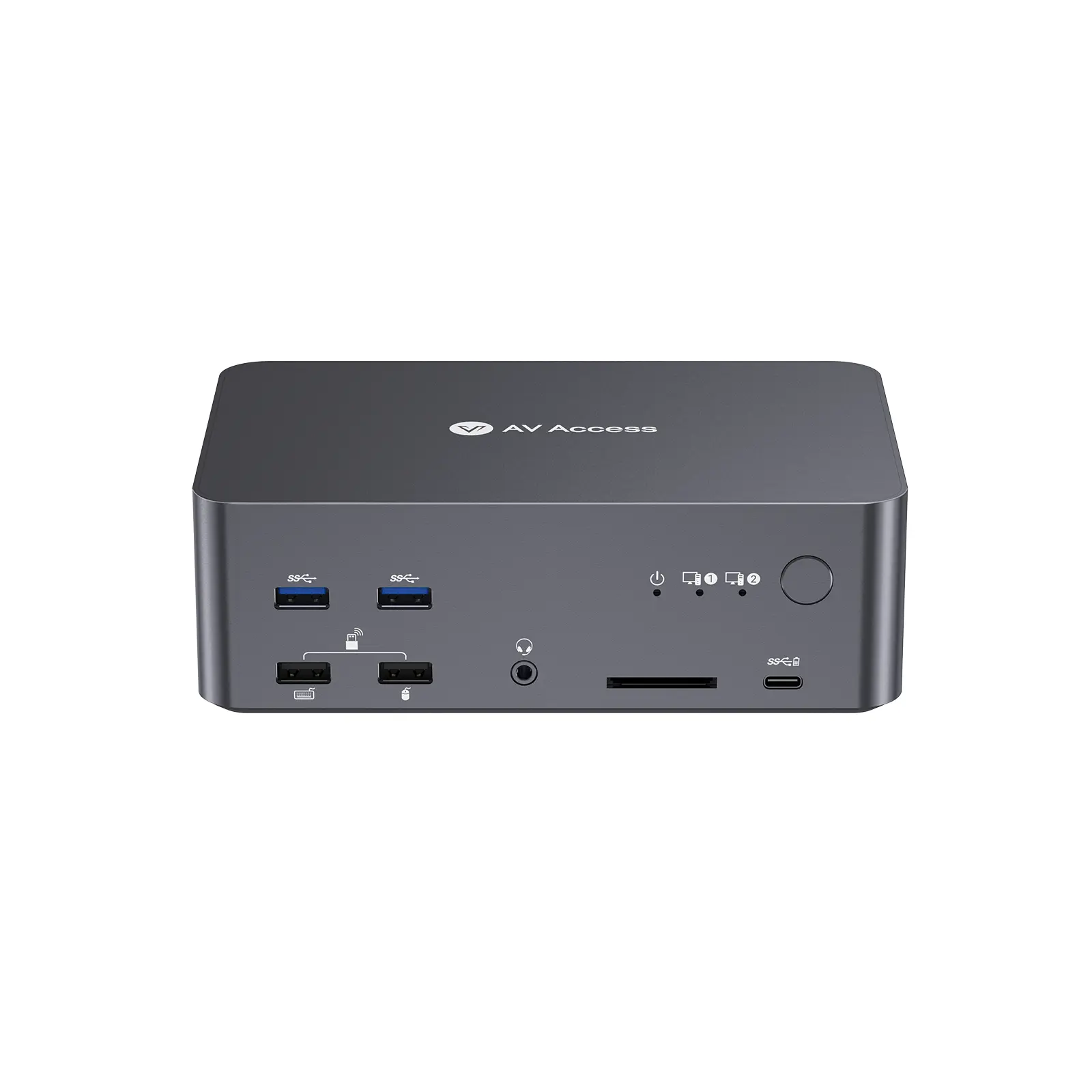 Share peripherals between two PCs via USB-C, USB 3.0, Ethernet, audio, and SD card slot.