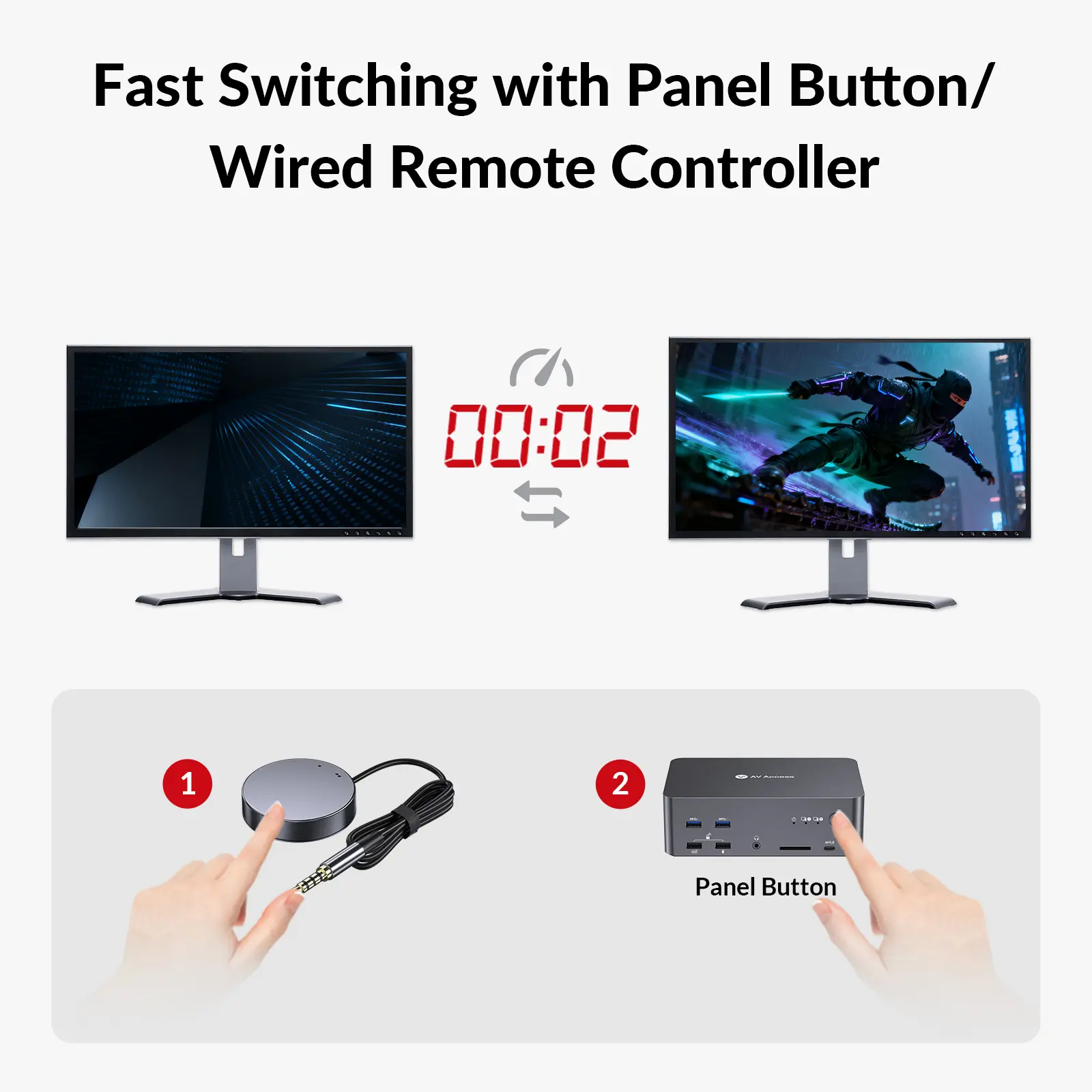 Switch seamlessly in 2-3 seconds via panel button or included wired remote controller.