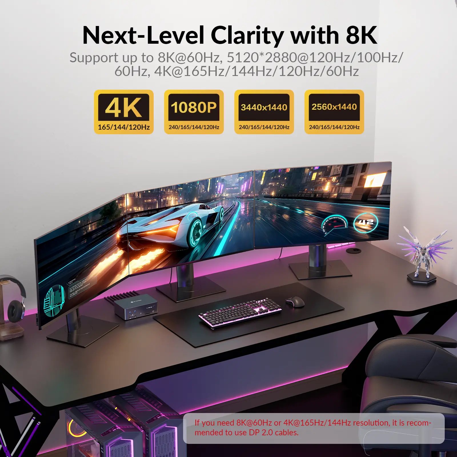 Supports up to 4K@165Hz and 1440p@240hz, ensuring ultra-smooth visuals for fast action and gaming.
