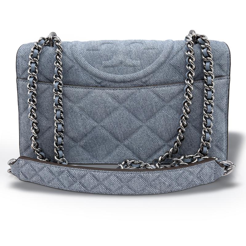This Tory Burch shoulder bag features a beautifully quilted light-wash denim with the iconic double-T logo subtly embossed on the flap.