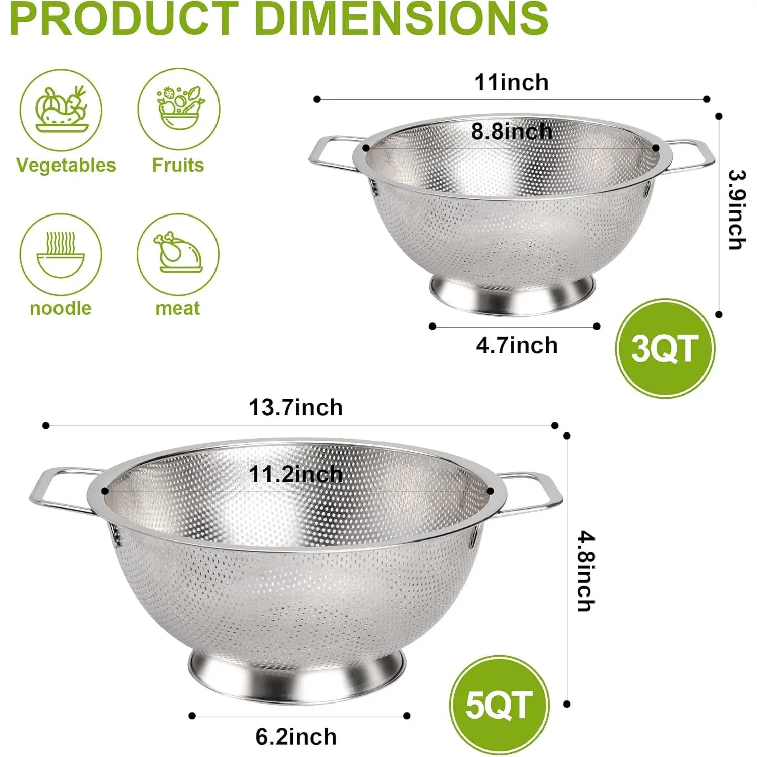 【DIMENSION】The maximum diameter of the colander is 8.8", the longest length including the handle is 11", and the whole height is 3.9". The 3-quart capacity makes this attractive even for small restaurants and food trucks.