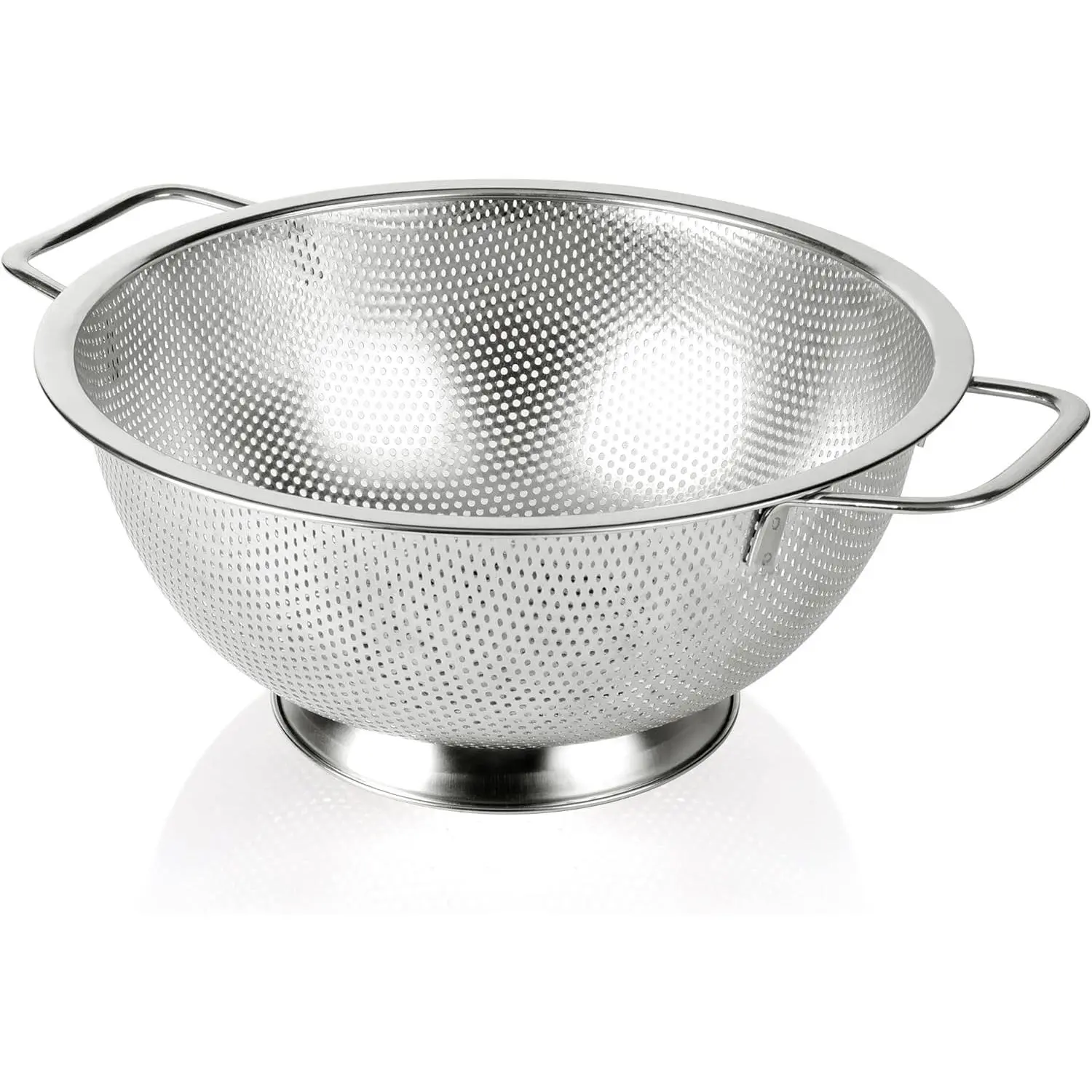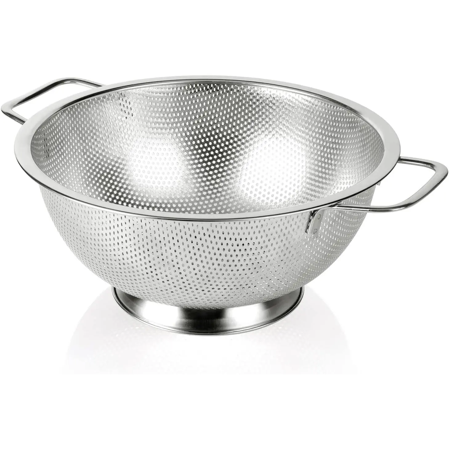 【DESIGN】Tiny and closely spaced holes mean your food drains fast, the mesh is sturdy and will not warp, stretch, or snag even under heavy foods(In particular, spaghetti won't fall through the holes); Footed design facilitates fast, easy drainage, the sturdy solid ring base keeps the colander from tipping over.