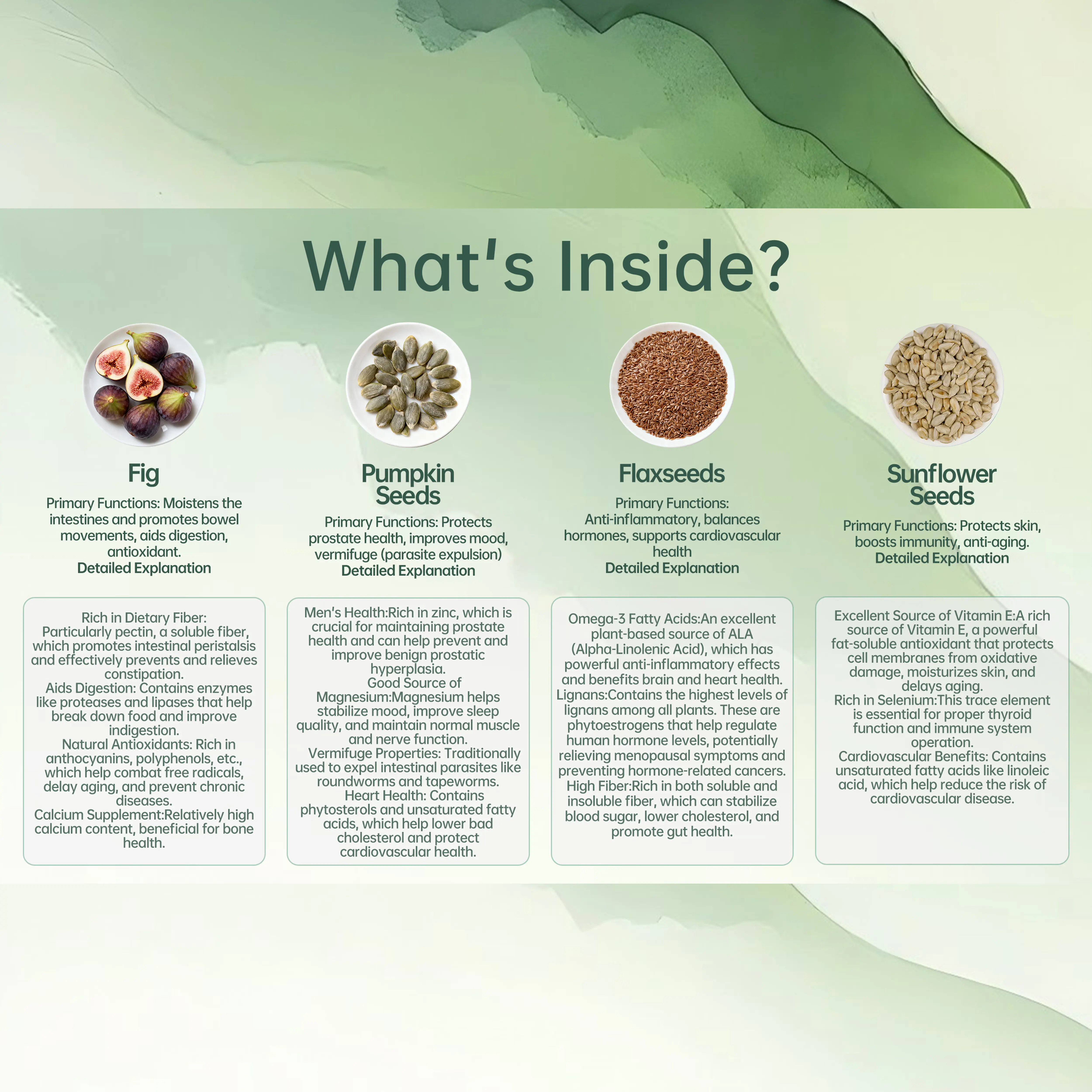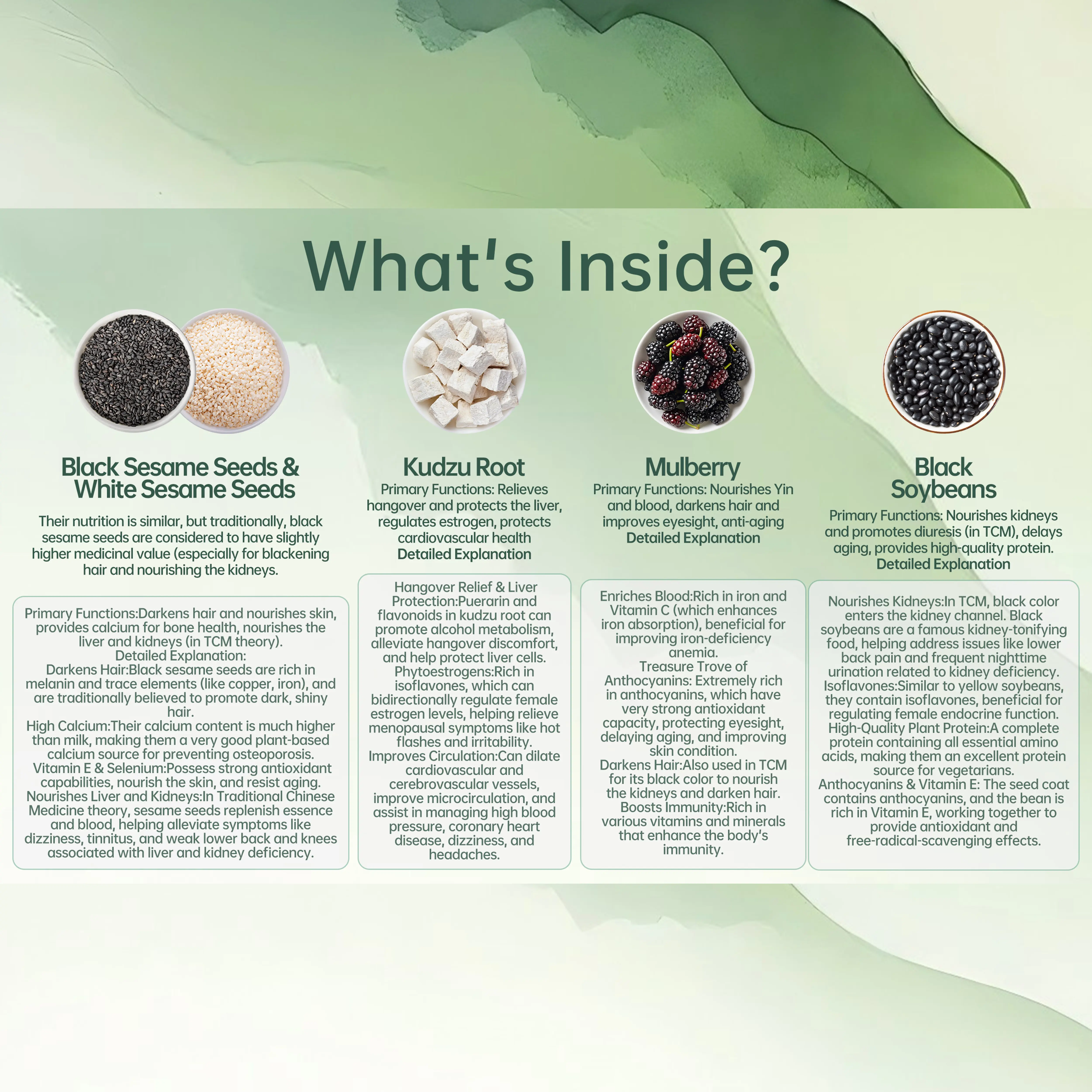 Black Soybeans,Mulberry,Kudzu Root,Black Sesame Seeds &White Sesame Seeds,SunflowerSeeds,Flaxseeds,PumpkinSeeds,Fig