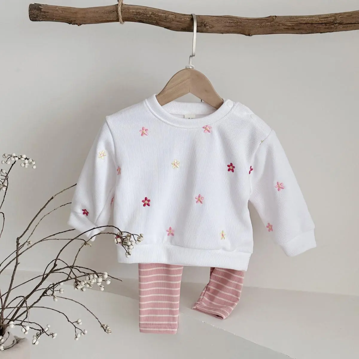Spring Autumn Baby Two Piece Set Colorful Flower Embroidery White Sweatshirt + Pink Striped Loose Long Pants Toddler Outfit