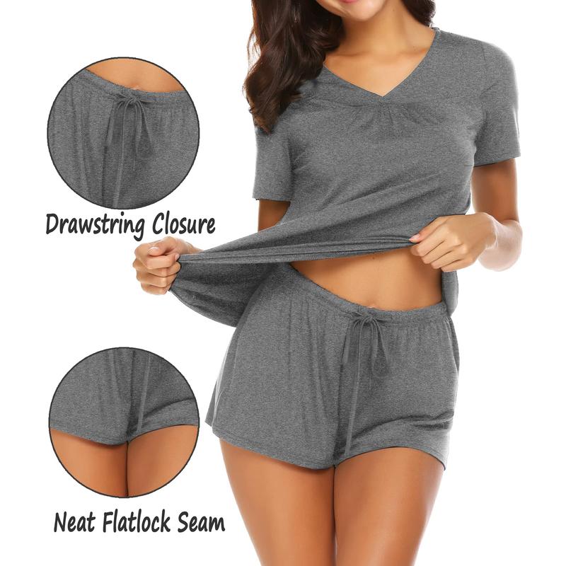 ·This soft pajama top features V neck, short sleeve, pleated front neckline,and the comfy modal pajama shorts is designed with elastic waist, drawstring and thigh-length