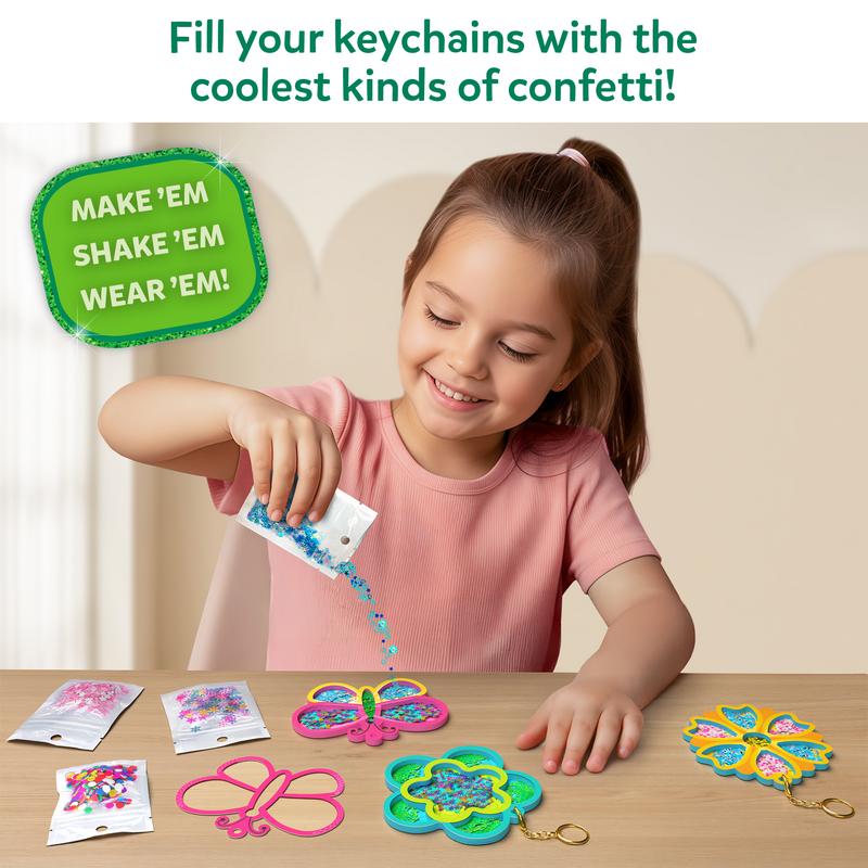 ·MAKE SHAKE-ITS THAT SPARKLE & SWIRL!: Fill the flowers and butterflies with sparkly beads and colorful confetti, then seal and give 'em a shake! Add the keychains and watch the confetti swirl as you hang your one-of-a-kind creations on bags, backpacks, or around your room.