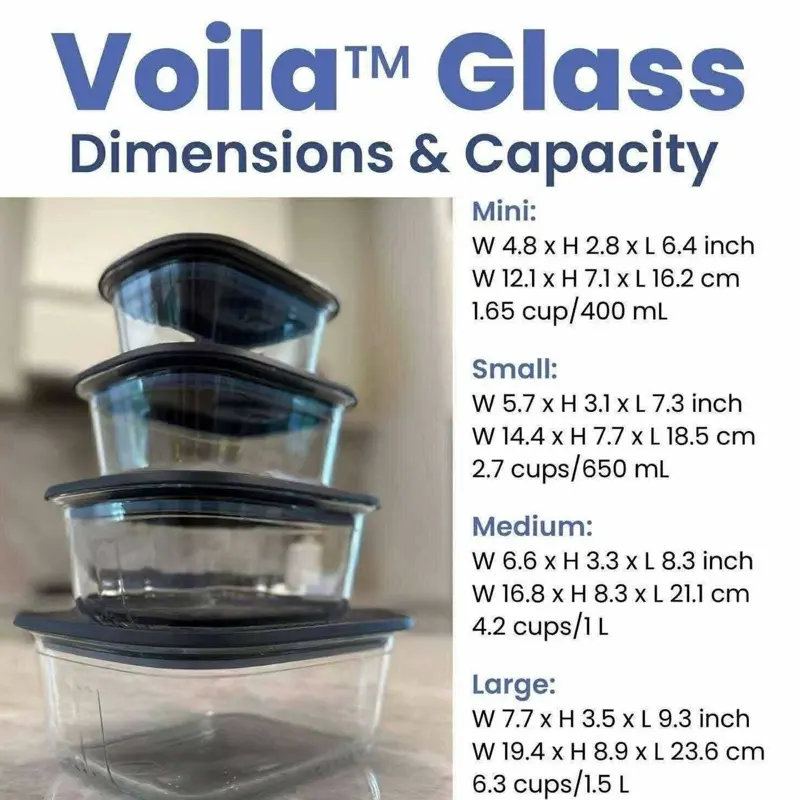Whether it’s new flavors or a family recipe, Voila™ Glass brings modern beauty to every table and fridge. The minimalist silhouette fits your style, and comes in three shapes and sizes: XL Rectangular (3.2 qt./3 L), Square (1.7 qt./1.6 L), and Round (1.8 qt./1.7L)