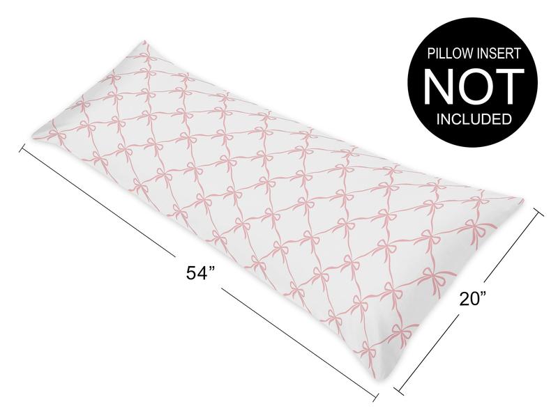 Elevate any room with a Sweet Jojo Designs body pillow cover. Use this body pillow pillowcase for the perfect room decor to add a stylish upgrade to your baby nursery, living room, apartment, home office, teen college dorm, guest room, gaming room, children bed room, family room, classroom, den, home theater, kids bed room, mud room or play room. This body pillow case features exclusive patterns and prints and made to fit most standard body pillows and create a unique look to be displayed for the perfect complete and cohesive bedroom look. The zipper closure design makes slipping the decorative body pillow case on and off pillow inserts to easily change out when it’s wash time. Display these designer body pillow case covers on beds, couches, chairs, benches, sofas, or even large bean bag chairs for ultimate comfort and relaxation wherever you are sitting or laying down. Pair your body pillowcase with your favorite Sweet Jojo Designs collections and coordinate with your crib bedding sets, twin or queen bed sets, window valances, and room decor accessories to give you a complete look for any room you are wishing to transform!Includes: (1) Full Body Pillow Case: 54 in. x 20 in. INSERT NOT INCLUDED. Easy machine washable and tumble dry low.This body pillowcase cover features an exclusive design of a shabby chic blush pink and white dancer princess bows print and the same print on the back.This full body pillow case cover is the perfect finishing touch to any livingroom, family room, apartment, teenagers college dorm, guest room, foyer, bedroom, den, home theater or playroom, making this your new household decor essential! Made to fit most standard body pillows, this long pillow case cover is great for children, kids, teens, pregnancy, and adults – making this the best addition to any room.A long pillow with decorative case can be an excellent statement piece on a bed, bench or couch. Its length allows for layering of different size, shape and color accent pillows to bring the home decor in your space to the next level in a budget friendly way. The hidden zipper makes it easy to remove and care for as needed. Buy as many as you need to swap between washes.Makes the perfect gift to coordinate with Sweet Jojo Designs bedding comforter sets, bed sheets, wall décor, window treatments and other accessories. Include it in your baby shower gift basket for the new moms maternity pillow or as a low budget room makeover item to add something special to the space.