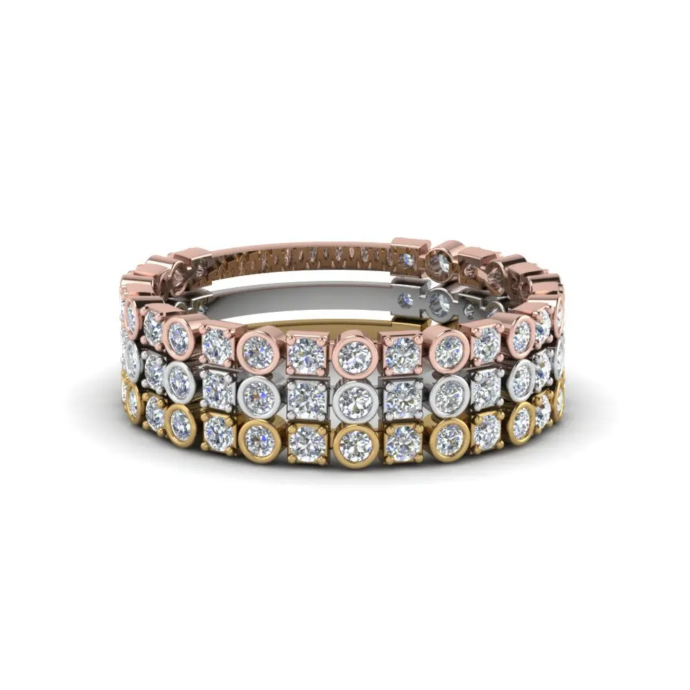 The Diamond Stackable Ring showcases small scintillating round shaped stones studded in a classic pave and bezel setting on three delicate bands stacked together with a marvelous three-tone pattern adding impeccable charm to your overall look.