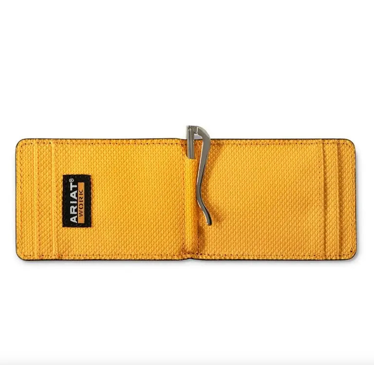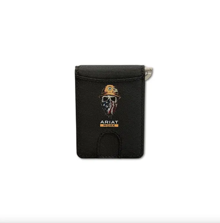 The Ariat Men’s Work “Born 4 This” Bifold Money Clip Wallet blends rugged Western style with everyday function. Crafted by M&F Western Products, this sleek black wallet features a bold USA skull graphic on the exterior and a secure money clip design. Inside, Ariat’s signature Rebar orange recycled mesh lining provides durability and contrast, with multiple card slots, a clear PVC easy-release ID window, and RFID blocking technology for protection against digital theft. Built with eco-friendly materials, the wallet uses 100% recycled polyester on the exterior and a blend of 99% recycled polyester with 1% leather on the interior. Practical, durable, and Western to the core.