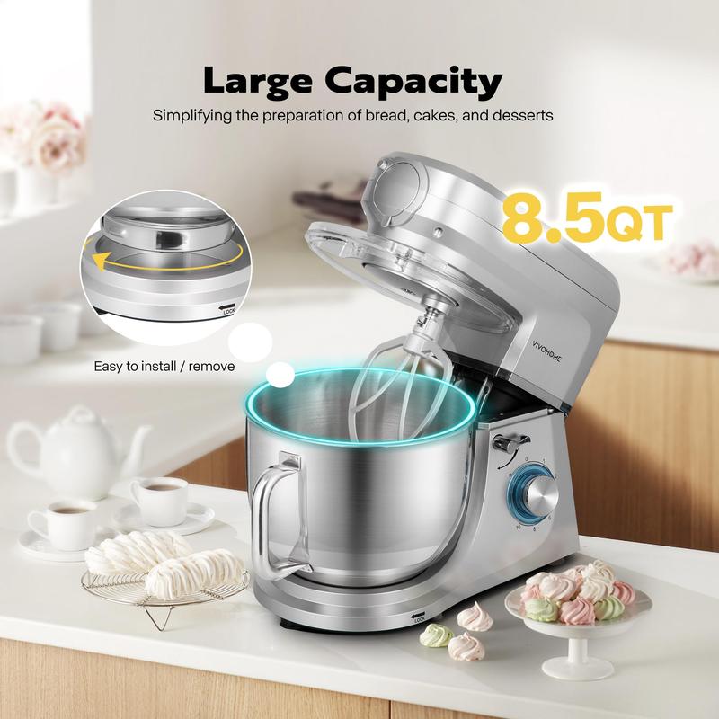 The VIVOHOME stand mixer features a 660W pure copper motor for faster, thorough mixing. Its 360° planetary mechanism ensures even contact between attachments and ingredients. Ideal for kneading dough and blending juices, this mixer handles large baking tasks effortlessly. The locking groove design secures the bowl, providing stable operation.