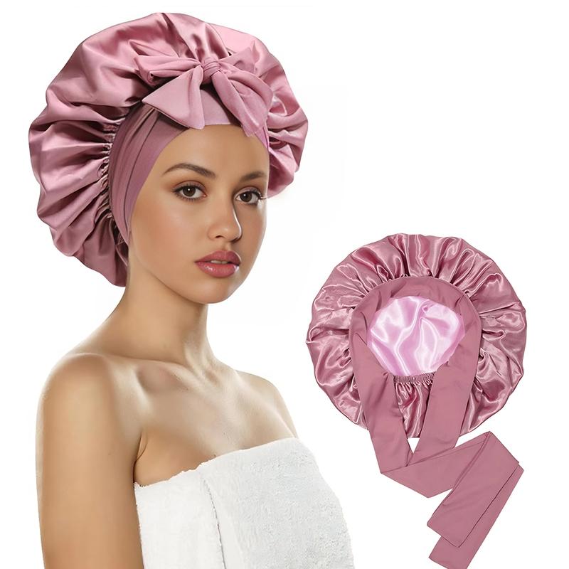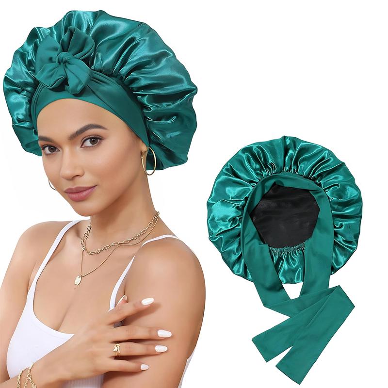 This Satin Bonnet is perfect for both sleeping and styling. It's a silk sleep cap, ideal for curly hair. The double layer design ensures comfort. The elastic tie band provides a secure fit. It's a heatless styling tool, making it perfect for silky haircare. A great Christmas gift idea for women.