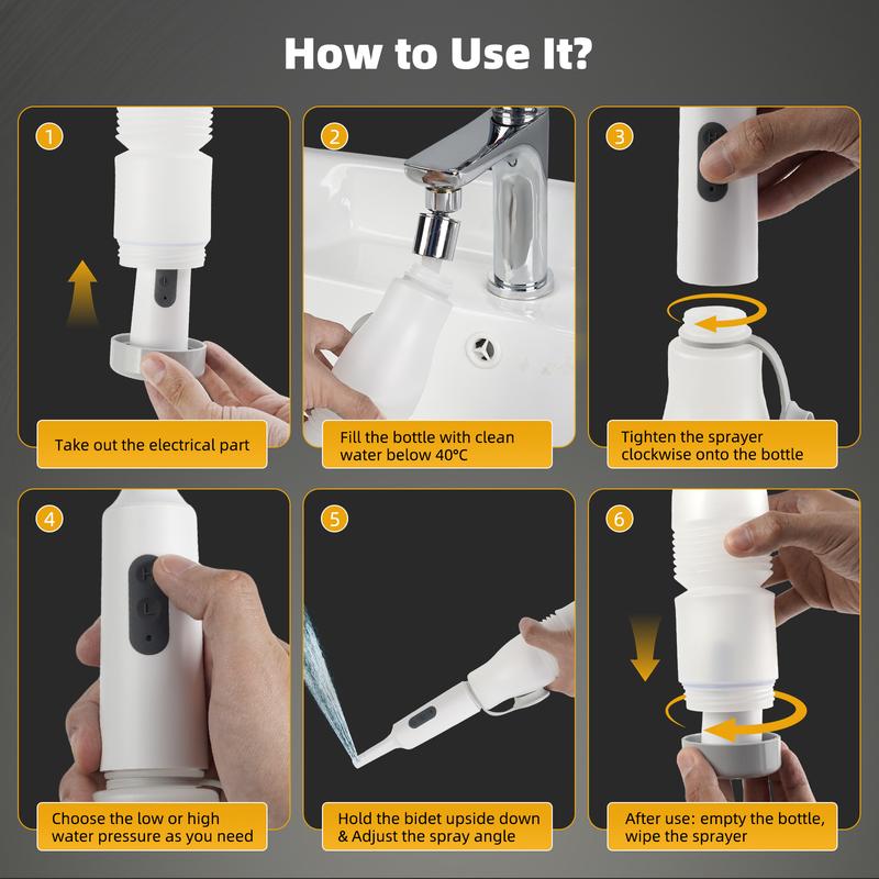 4 Spray Modes & Adjustable Water Pressure: This upgraded travel bidet combines adjustable high or low pressure with a choice of 3-hole or 5-hole nozzles to provide 4 distinct water flow experiences. From a soothing mist for sensitive skin to a vigorous stream for effective cleaning, it is tailored for postpartum recovery, sensitive area cleansing, and everyday hygiene