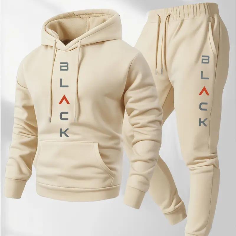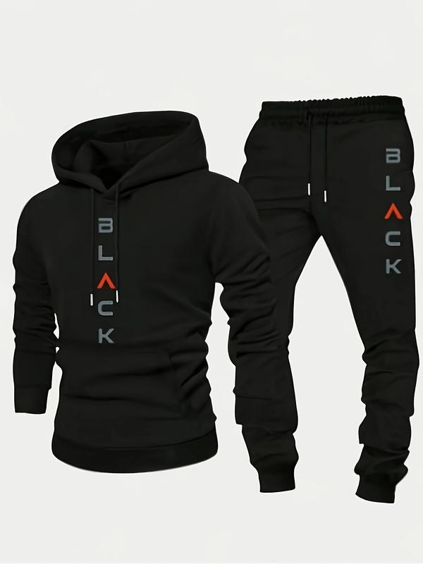 Men's Complete Outfit - Stylish Hooded Sweatshirt & Joggers Set with BLACK Print Gray Casual Streetwear Long Pants Matching Hoodie Perfect for Fall Winter Cozy Clothing Sporty Look Non Stretch Fabric