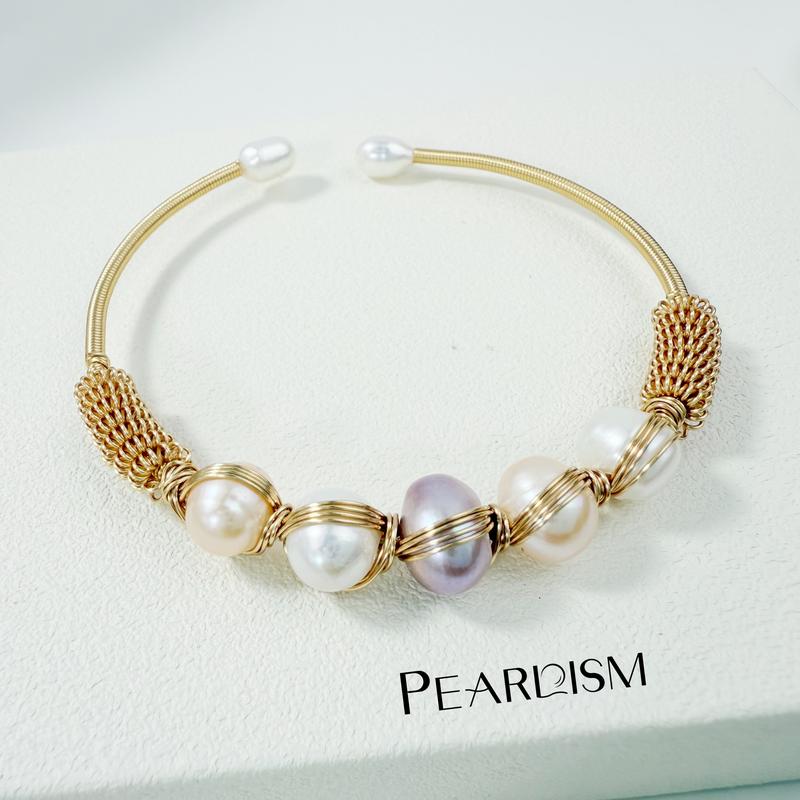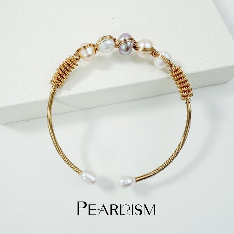 5. PEARLISM Seedless Freshwater Pearl Wire-Wrapped Cuff Bracelet | Gold/Silver Tone Multi-Color Pearl Cluster Statement Bangle-PSBG1602S/G