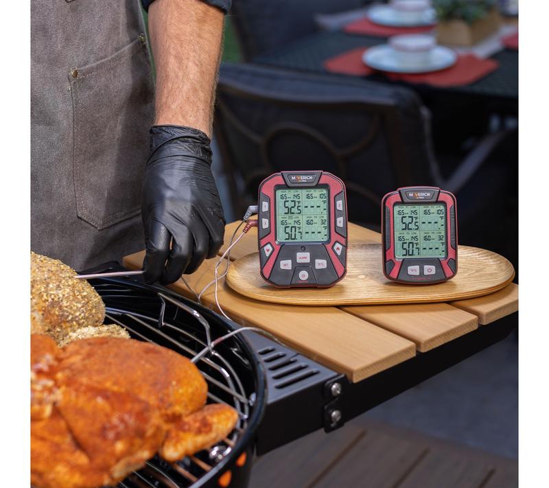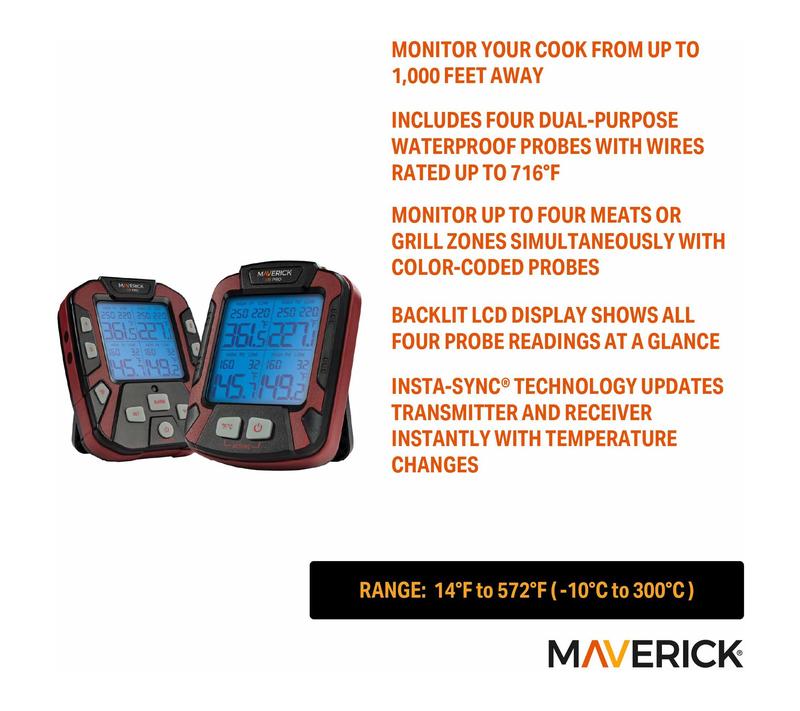 Master backyard cooking with this wireless grill thermometer, designed so you can mingle with guests or relax indoors while monitoring up to four different meats or grill zones. Featuring color-coded waterproof probes, simple temperature tracking from up to 1,000 feet away, and smart alerts, this handy accessory helps take the stress out of grilling for family feasts and summer barbecues. From Maverick.