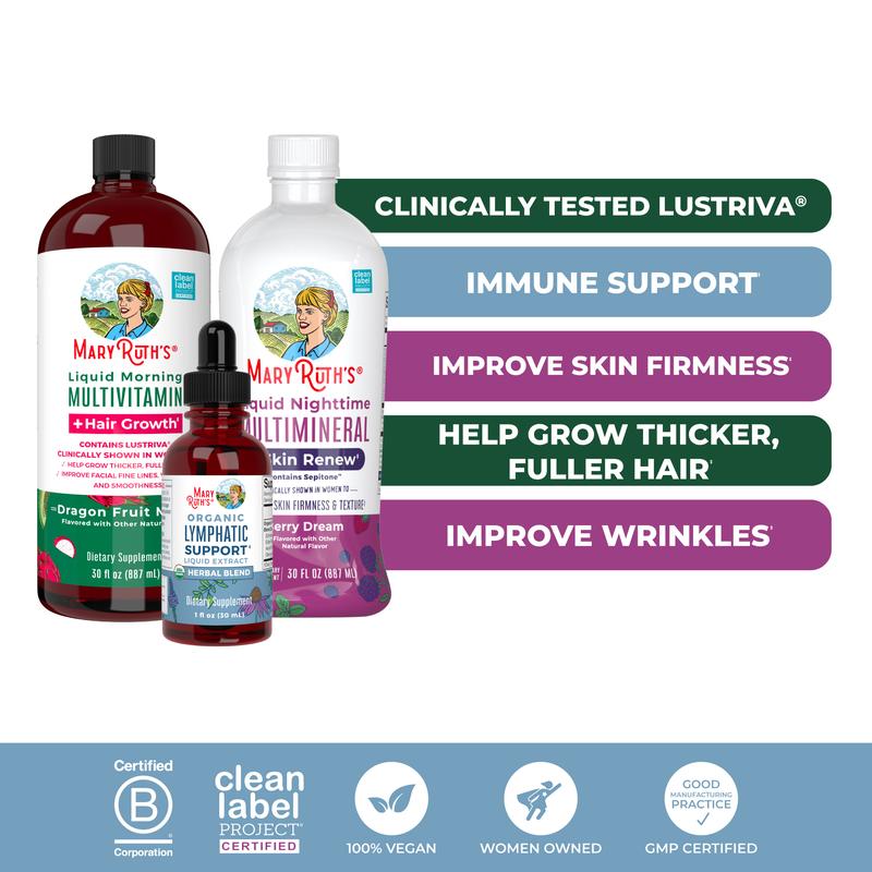Create the perfect day-to-night wellness and beauty-from-within routine with this nourishing Daily Lymphatic Support + Liquid Hair Growth & Skin Renew Bundle! With clinically shown Lustriva, our best selling dragon fruit melon Liquid Morning Multivitamin + Hair Growth formula helps support thicker, fuller hair and smoother skin in women — while also delivering daily wellness support with essential nutrients to support energy metabolism, immunity, and more. And to complement routine, our Lymphatic Support Herbal Blend features a synergistic combination of herbs, including Echinacea purpurea Root, European Elder Berry, Plantain Leaf, and more to support your lymphatic system. This thoughtfully designed trio brings hair, skin, and gentle lymphatic support together in one enjoyable routine. End your day with support for both wellness and beauty from within with our delicious Liquid Nighttime Multimineral, featuring Sepitone, clinically shown in women to improve skin elasticity, firmness, and fine wrinkles, plus zinc, selenium, and vitamin D to support bone health, immunity, and overall wellness. This thoughtfully curated trio pairs key nutrients with targeted hair growth, skin health, and lymphatic support in three easy-to-take liquids you can fit into your daily routine.