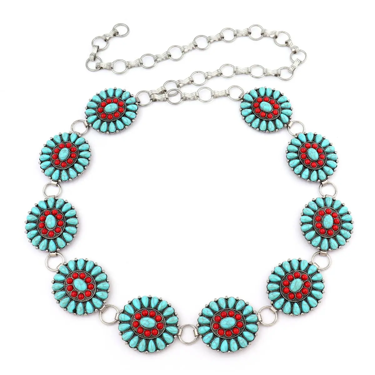 This fiery concho belt is pure desert drama. With vibrant red and turquoise beading, each round concho pops like a painted Arizona sky. A bold statement for rodeo nights, boot scootin’ days, and every wild ride in between