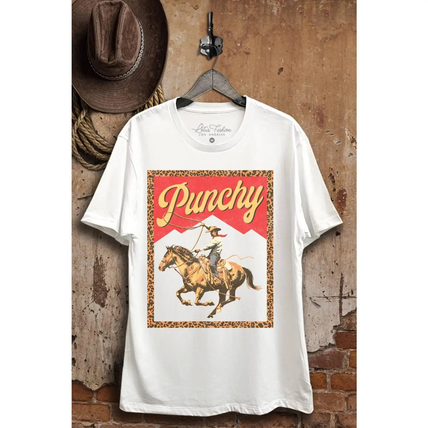 Bring the rodeo heat with this bold “Punchy” graphic tee, framed in a leopard-print border and featuring a cowboy mid-lasso. Made from 100% cotton for all-day softness and breathability, it’s perfect for wrangling style and comfort.