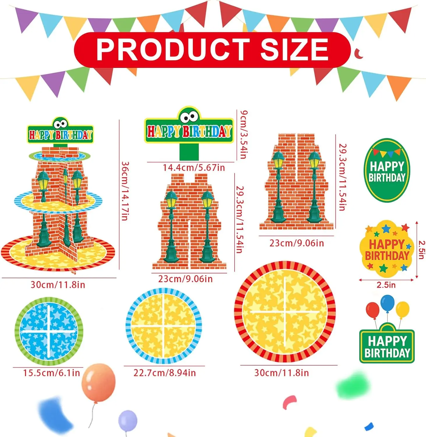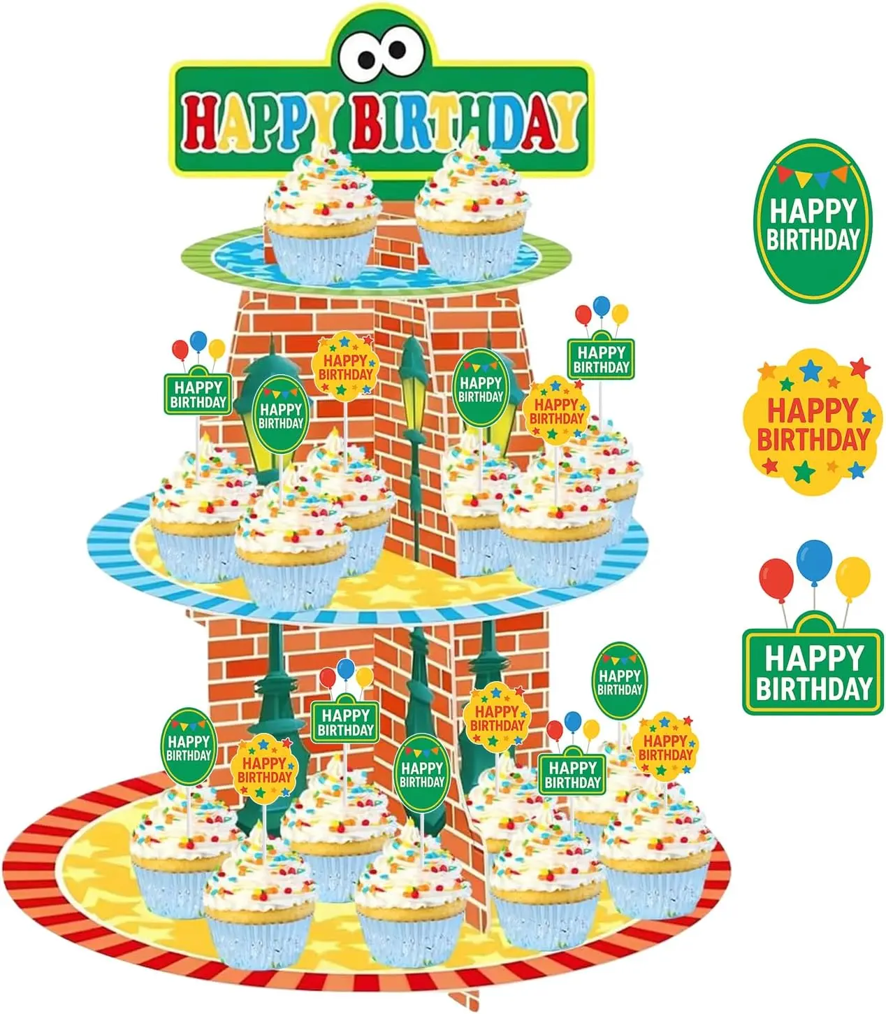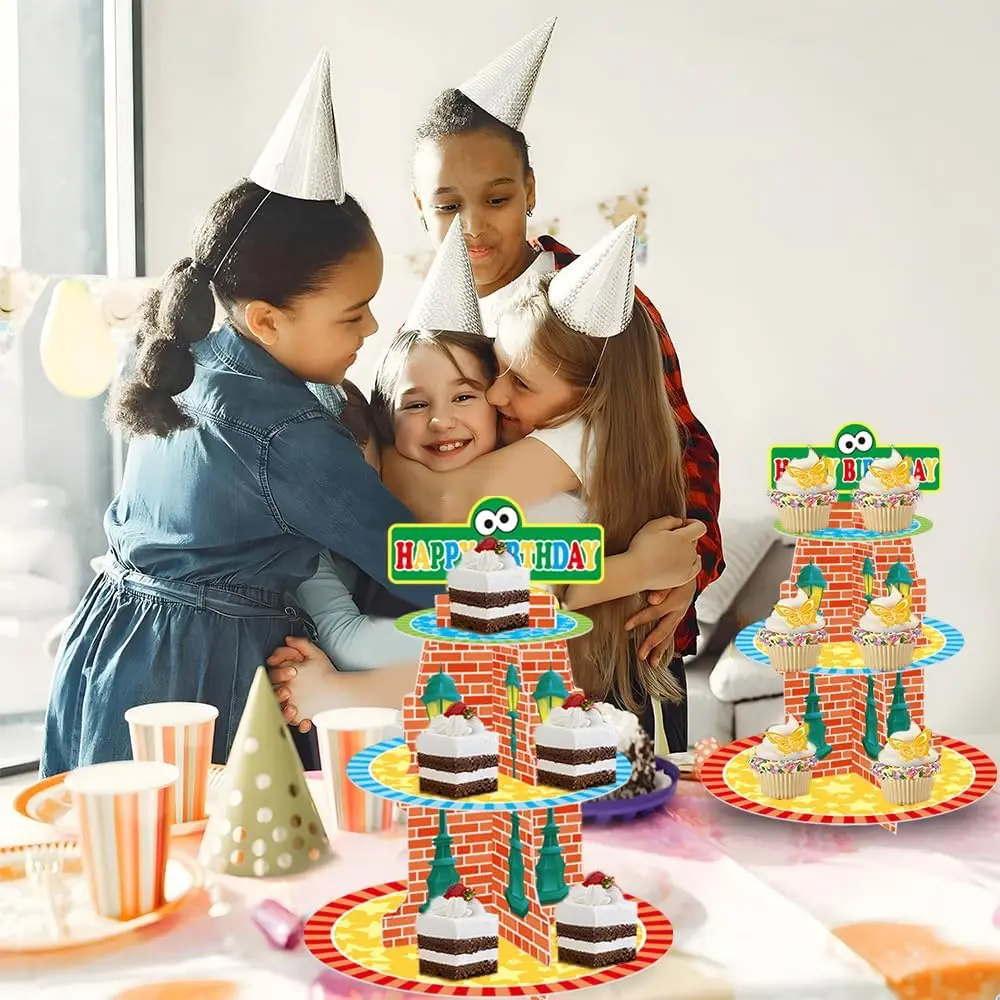 ·Cartoon Street Design: This three-tiered cupcake stand features a fun cartoon street theme, making it perfect for kids' birthday parties. 🎂