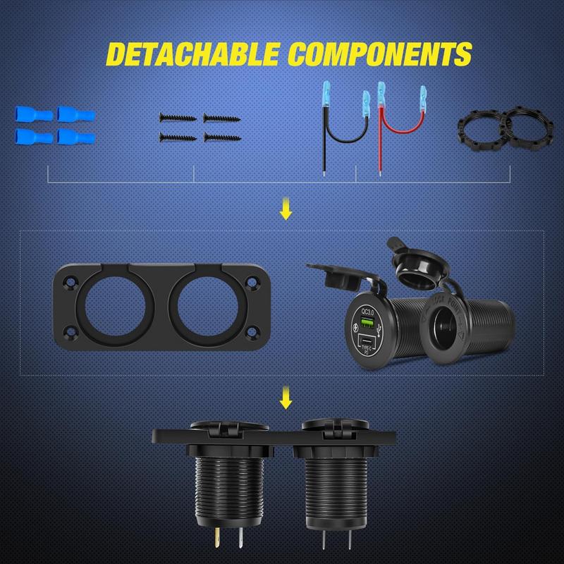 The USB charger and cigarette lighter socket is detachable and can be replaced with other components that fit the panel. Meet your DIY use.