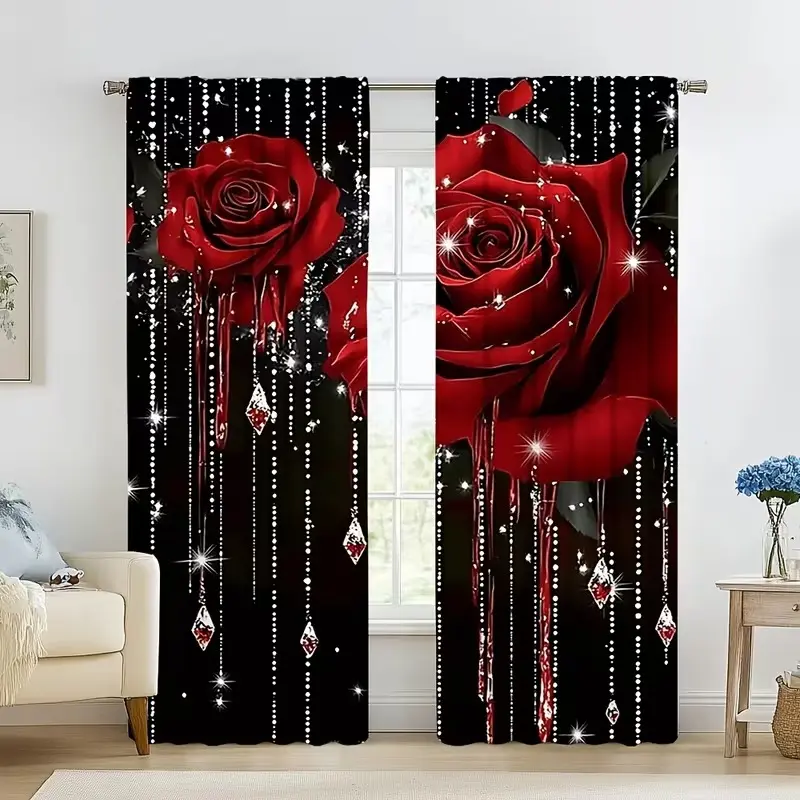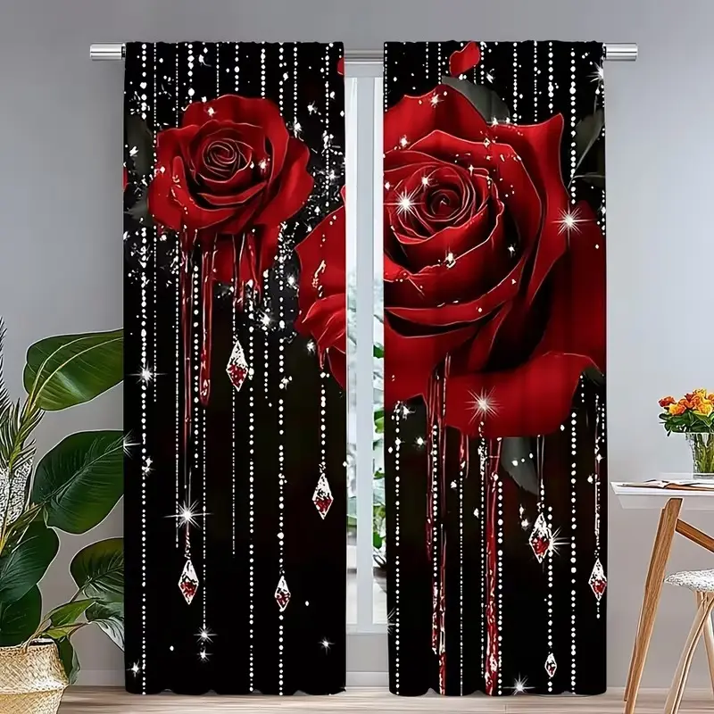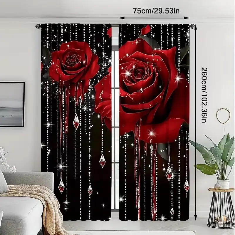 2-Piece Pearl Rose Print Window Curtain Set, Durable Semi-Transparent Polyester Fabric, Washable, Ideal for Bedroom/living Room/library
