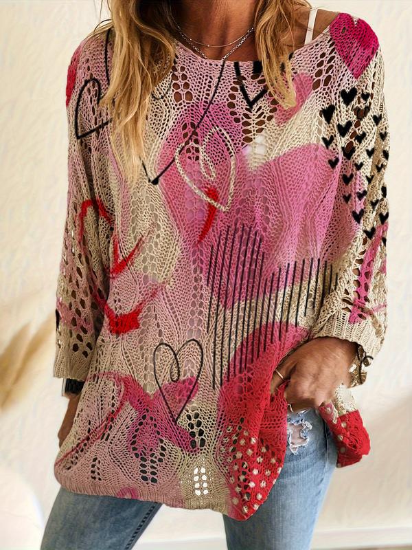 Women's Casual Knit Top, Heart Pattern Long Sleeve Sweater, Loose Fit Batwing Shoulder Design, Spring Summer Fashion