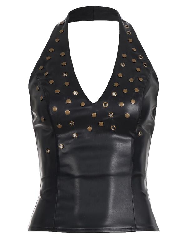 Vintage Street Style Antique Studded Copper Grommet Eyelet Backless PU Leather Halter Top for Women, Sleeveless Slim Fit Short Vest