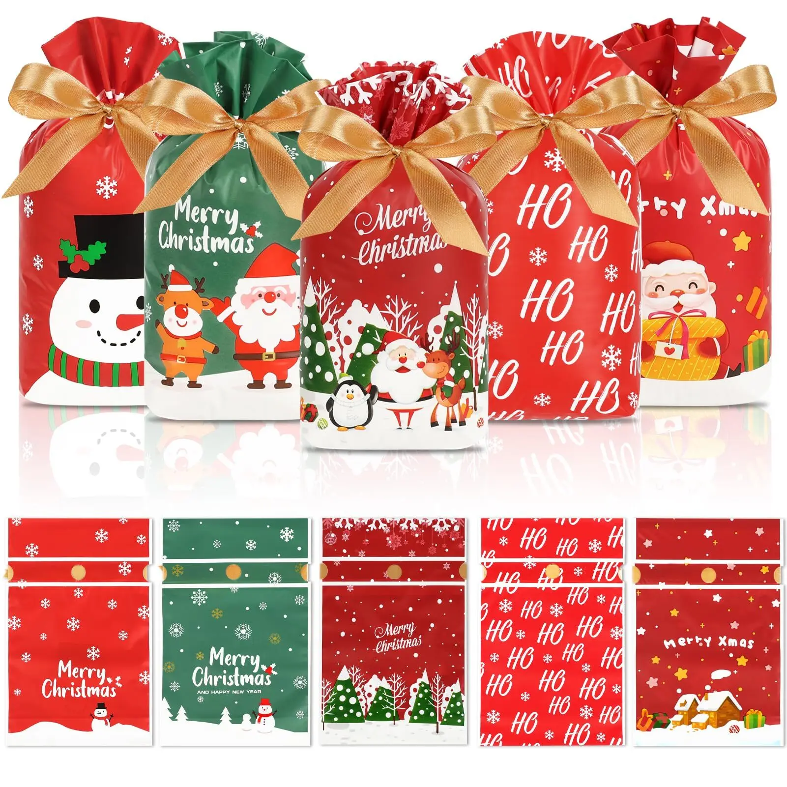 [Durable Food-Grade Plastic: Made from high-quality food-grade PE plastic these Christmas treat bags are flexible and sturdy. Ideal for holding candy chocolates snacks small gifts and more 2 Festive Designs in One Bag: Enjoy double the holiday cheer with different Christmas patterns on each side. You will get 9 Xmas theme pattern with our small Christmas gift bags Convenient Drawstring Closure: These Christmas candy bags are with a built-in gold satin ribbon near the top that cinches the bag perfectly and you can tie a cute bow Spacious: Measuring 5.8x9x2.4 inches with an expandable bottom these small goodie bags are spacious enough to hold a plenty of candies cookies cake pops popcorn and other small gifts Versatile: These Christmas goody bags are not only great for Christmas but also ideal for Christmas themed birthday parties New Year party adding a unique touch to your event]