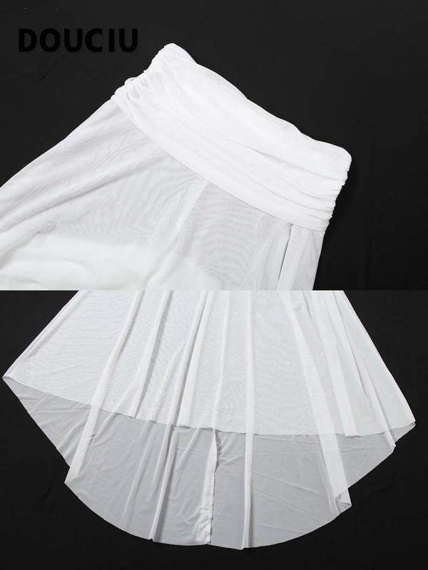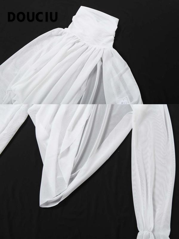 5. DOUCIU Summer Beach Vacation Yacht Party Sexy Hot Beautiful Cool Women'S Thin Style Solid Color Mesh See Through Long Sleeved Top Skirt Two-Piece Set